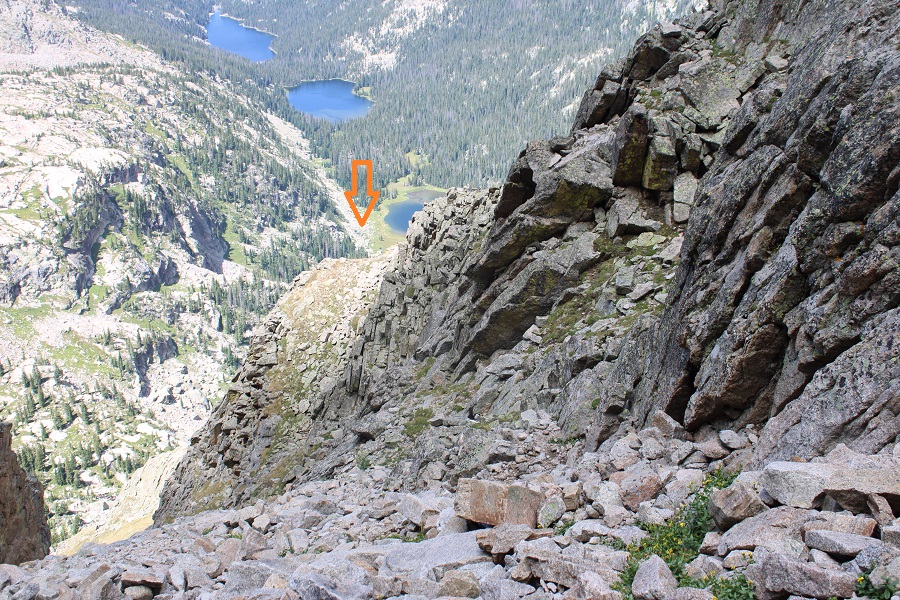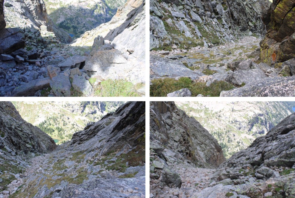 This was at about 12160’, where I stopped descending the gully, and looked for a grassy ledge climbers right.