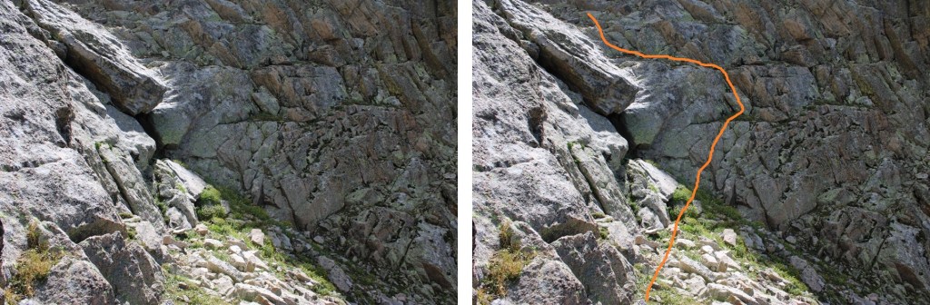 For those of you doing this the opposite way, here’s a look back at the grassy ledge I descended.  You can see why I had to drop down so low in the gully, with the sheer cliff face to navigate.