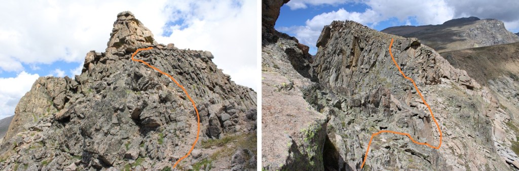 I went to the right of this boulder.  Getting through was sketchy class 3.  The boulders were large, but there was a lot of empty space between them, and they didn’t feel solid.