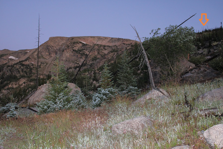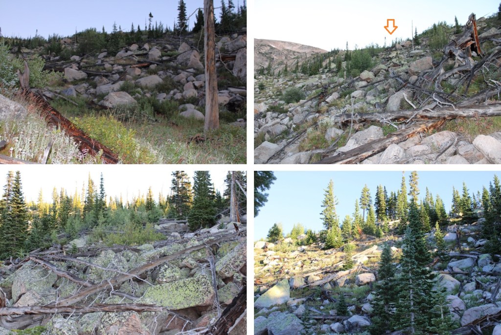 This is where I startled a moose.  He was about 15 feet away from me when I saw him, so I quickly ducked behind a large boulder.  Usually, moose run away when they see you, or ignore you, but this guy seemed interested in me.  I’ve seen probably over a hundred moose in Colorado, and I’ve only been charged once.  This guy looked like he wanted to charge me, so I remained hidden.  For a solid 15 minutes, every time I peeked out from behind the boulder, he was still staring at the boulder I’d hidden behind.  I know moose have poor eyesight, so while he knew I was still there, he was probably trying to figure out if I were a threat or not.  (That’s Chickadee Pond in the background).