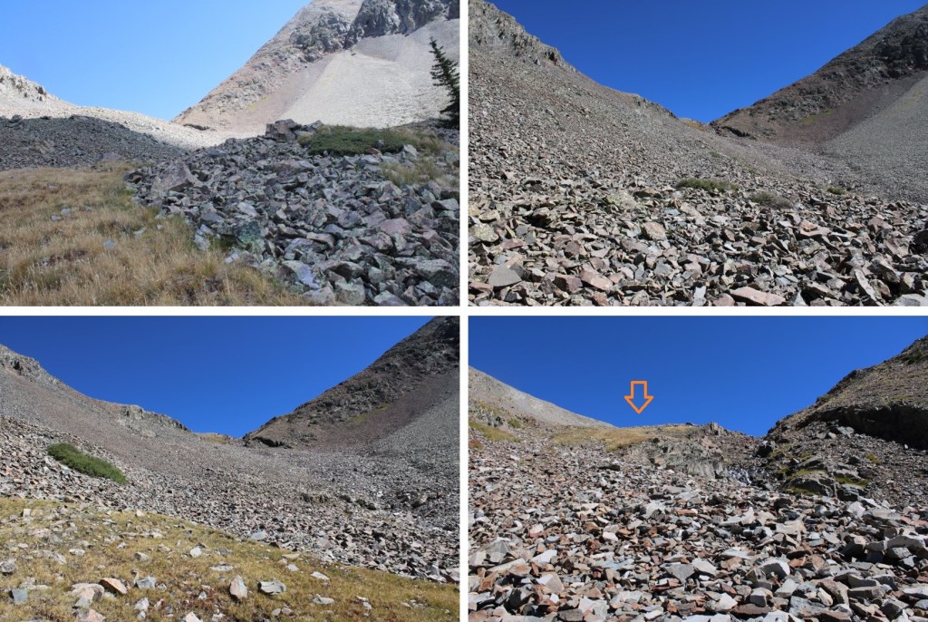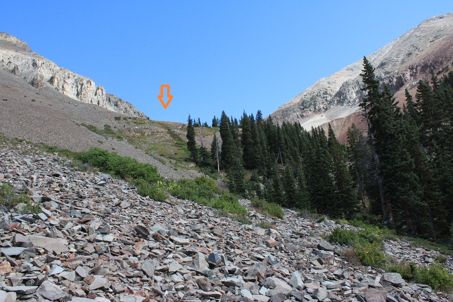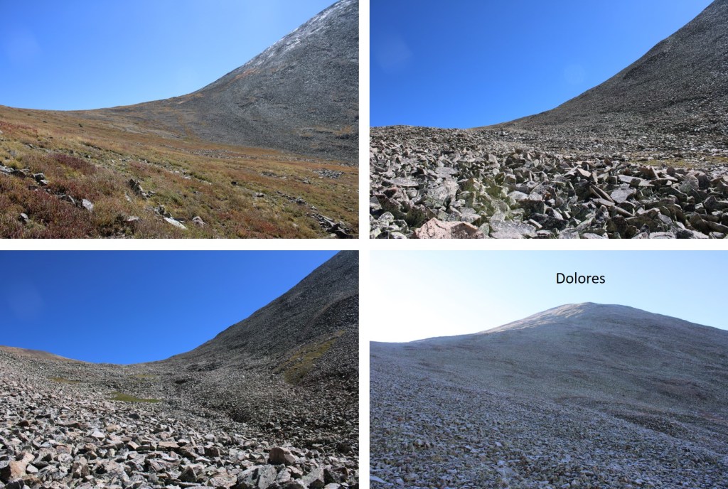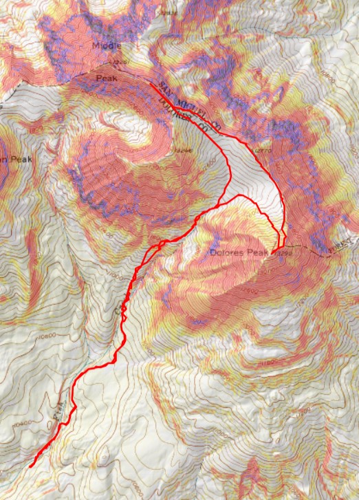 I continued heading up the center of the drainage, towards the Middle/Dolores saddle