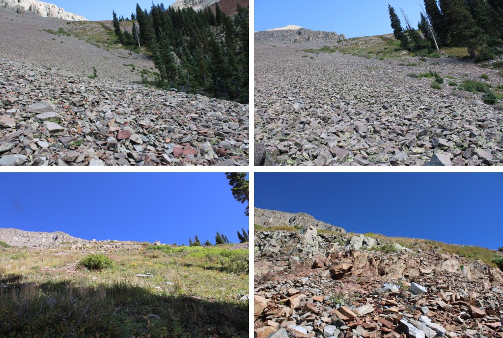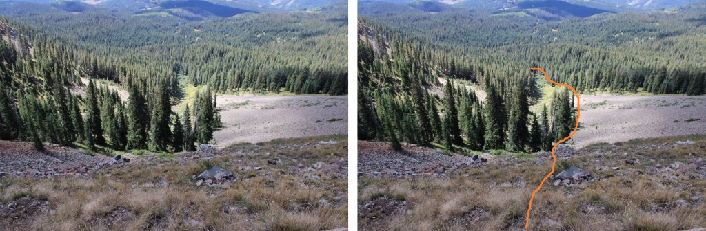 In the morning I went high, sticking to the talus, and I would not recommend this route. Stay low, and the terrain is much easier to navigate (2+).
