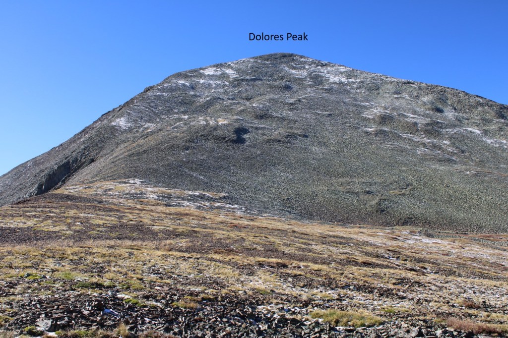 Once at the saddle I turned right to head up the ridge to Dolores Peak. If you stay on the ridge directly, you’ll find game trails through the rock leading to the summit. This is all class 2, choose your own adventure heading southeast towards the summit.