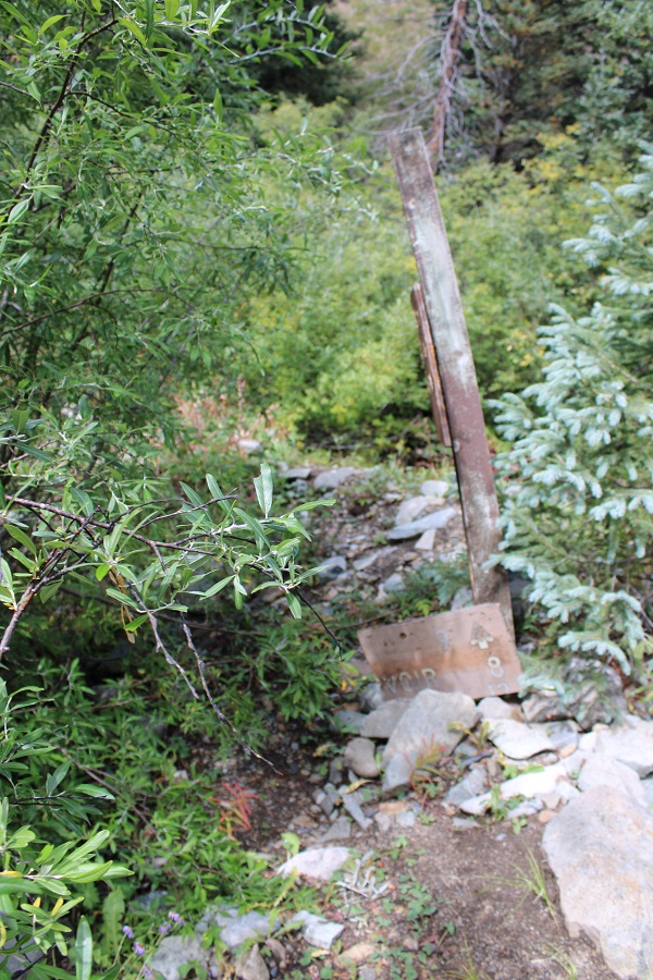 An obvious game trail picked up on the other side. On my way back, I found this sign behind some very overgrown willows. It was difficult to make out, but shows this used to be an actual trail at one point. Now however, it can be difficult to follow.