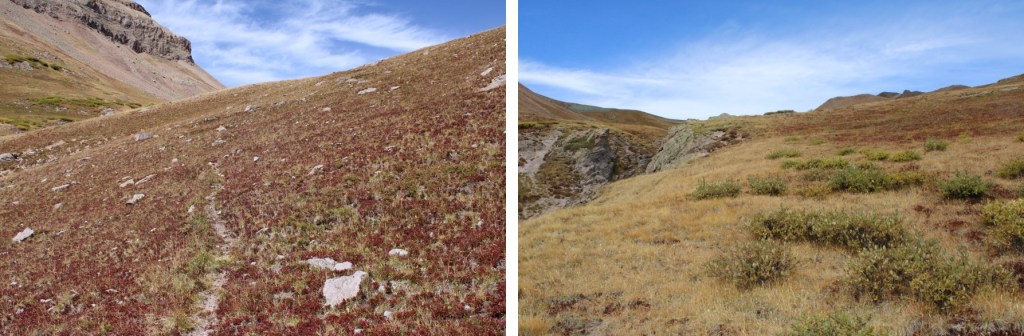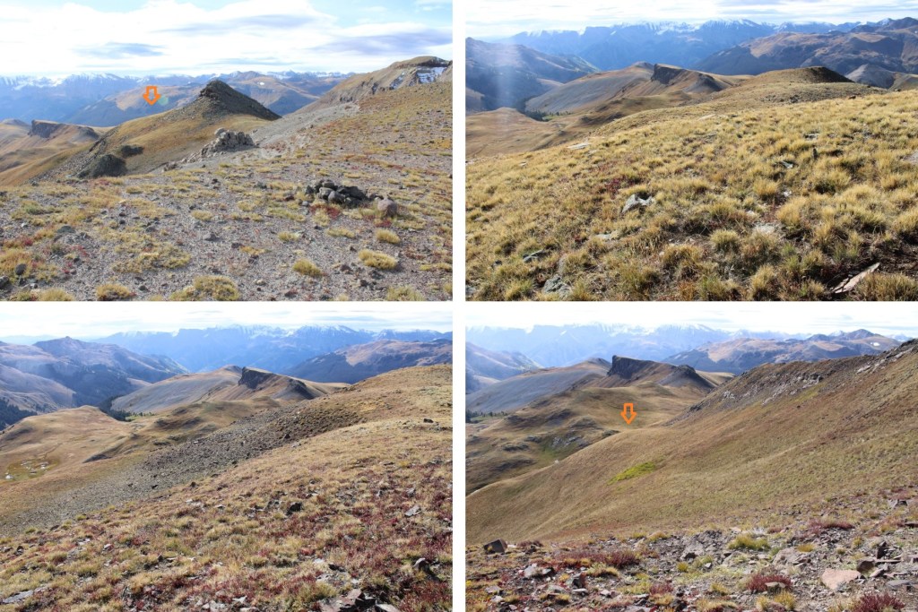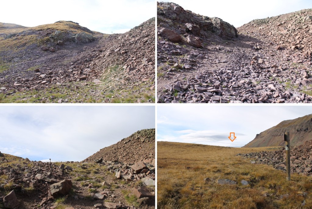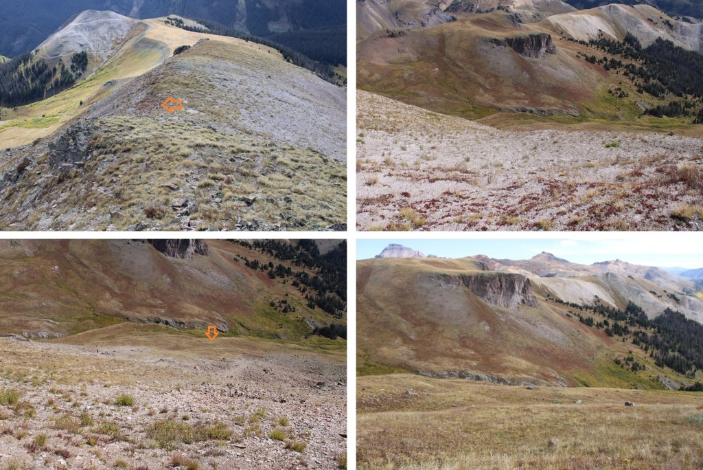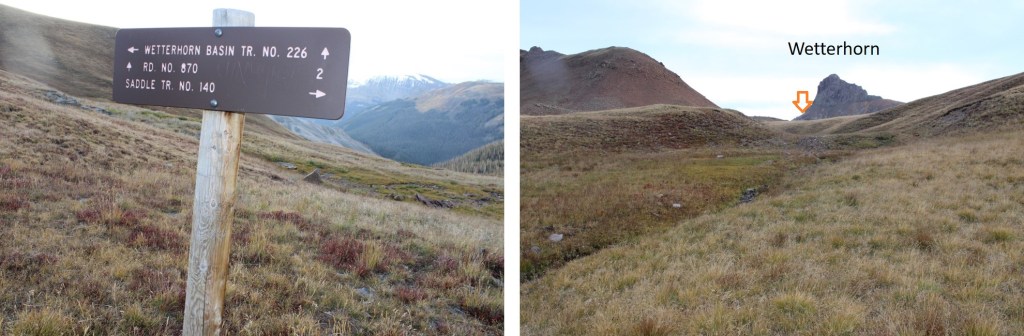 I quickly came to another sign, that directed me to descend into Wetterhorn Basin.  Initially I did, but as soon as I could turn left onto the tundra I did and followed tundra to the ridge, heading northwest.