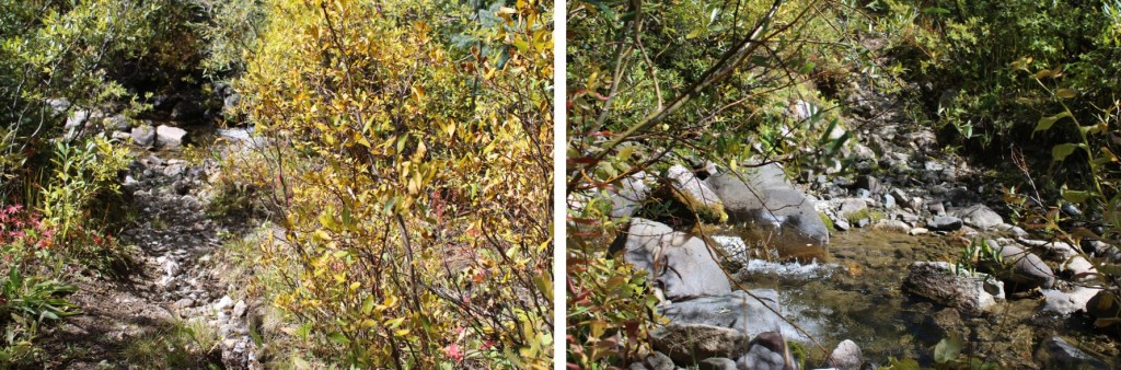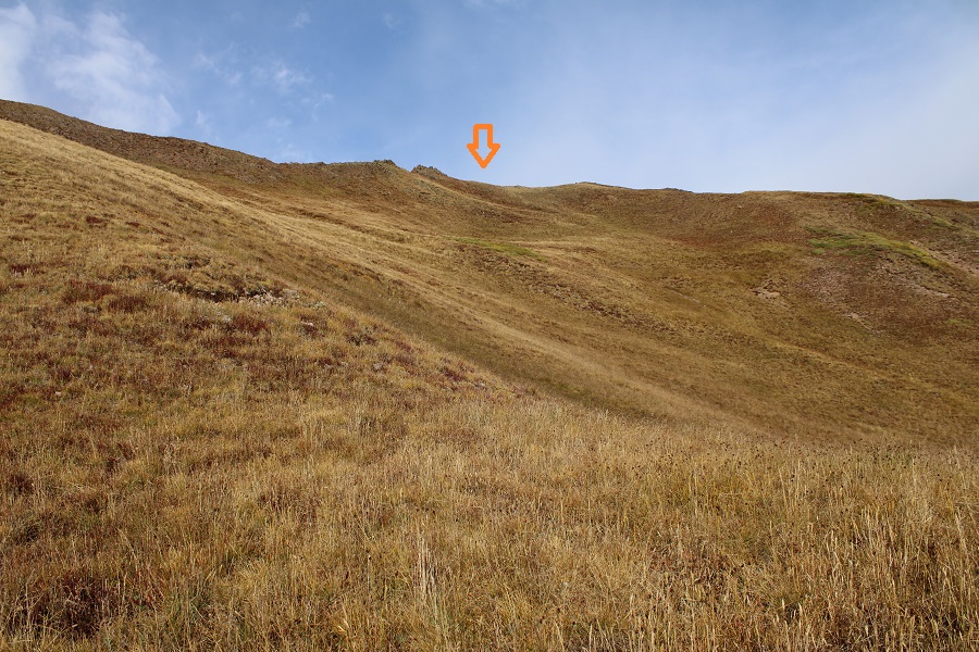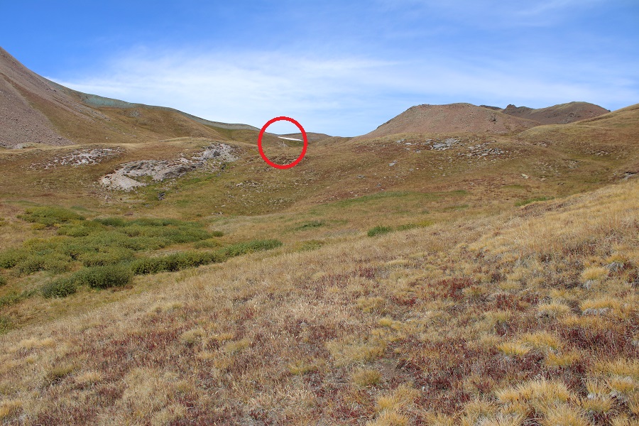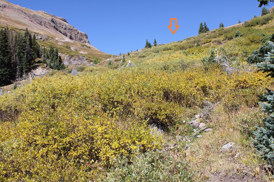 At 11700’, the ‘road’ started switchbacking the opposite direction, and I started bushwhacking through the willows.  There were game trails through the willows. The main goal is to stay to the right of the creek. I was headed here: