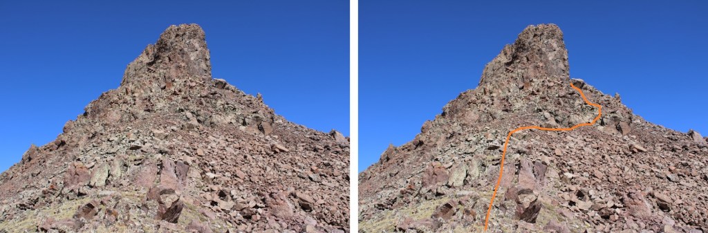 Getting around the rocks was class 2+.  It looks more difficult than it is, but it’s full of loose rocks and scree.  Here’s the overall route I took: