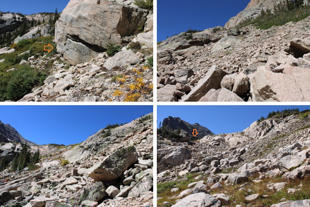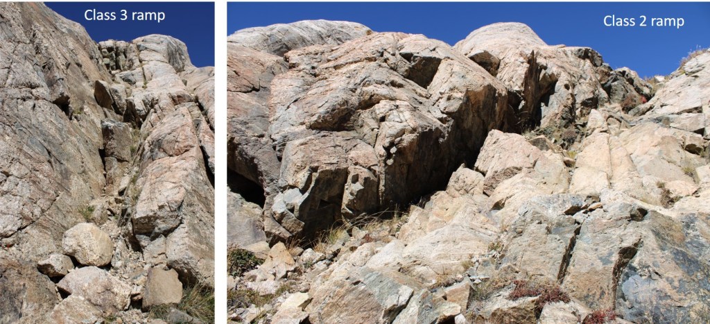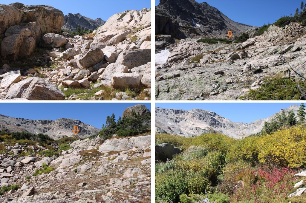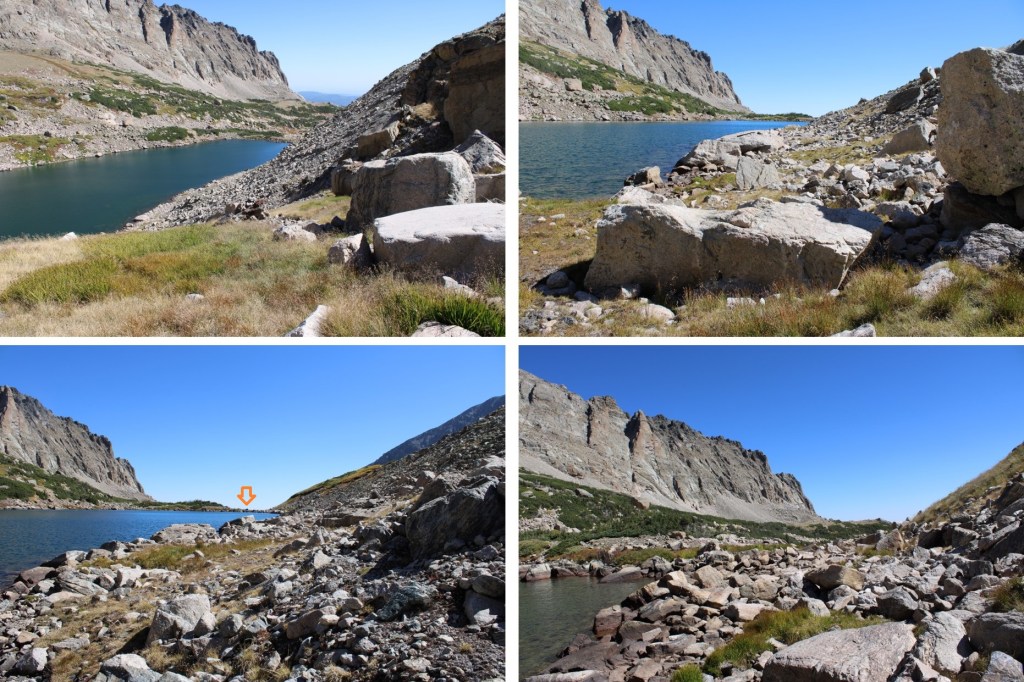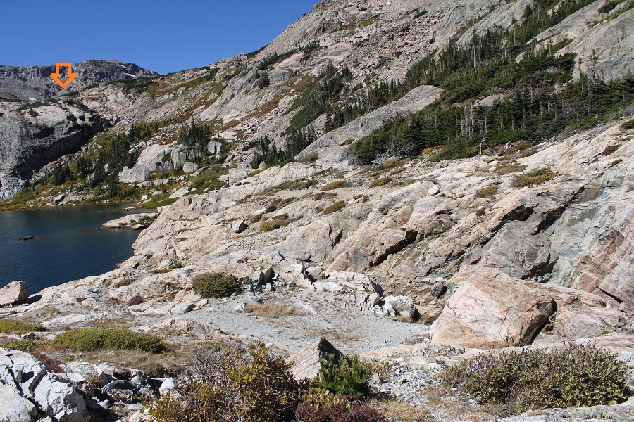 I was able to keep this class 2, but there are class 3 options.  First, I descended down to the lake, then ascended a class 2 ramp.  There’s an easy class 3 ramp here as well.