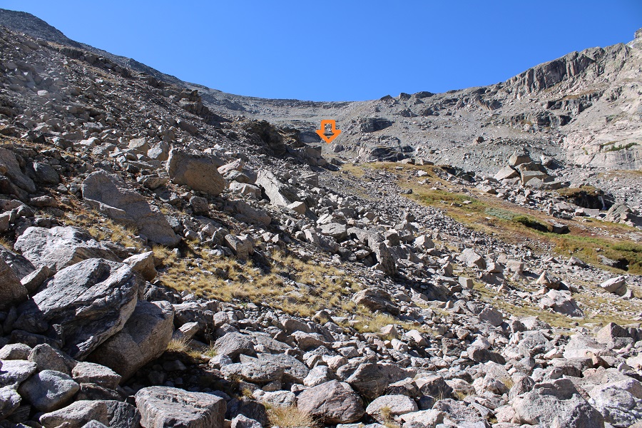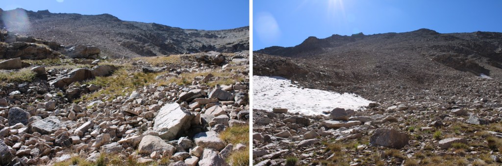 If you’re following my GPX file, you’ll note I ascended to the left on the rocky area.  I wouldn’t recommend this, as it’s extremely steep.  I ended up gravitating towards the rocks to avoid the steepness of the scree, and got into sketchy class 3 territory (lots of very lose rocks the size of bowling balls on top and around larger rocks, forming small, unstable gullies).  Instead, this can be kept class 2 by taking the grassy gully up.