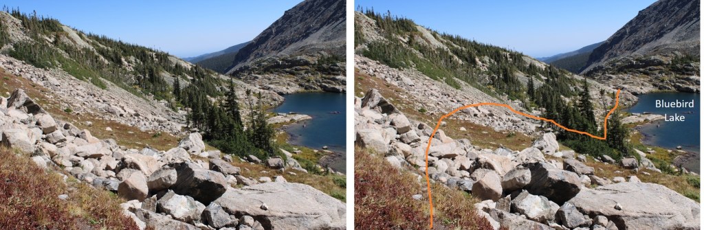 Now the fun begins!  The class 1 trail that got me to Bluebird Lake stopped at Bluebird Lake.