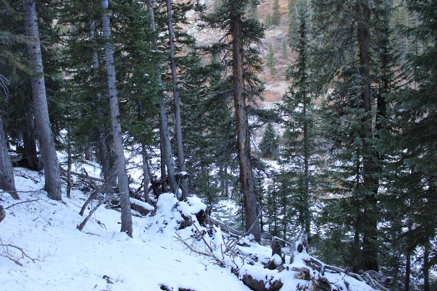 I descended 860’ down the ridge, to about 12260’ of elevation, then took an old road down into the basin.  The road quickly dissolved, and I bushwhacked east through the trees, looking for a hiking trail I knew would be below.  Here’s my route out of the basin