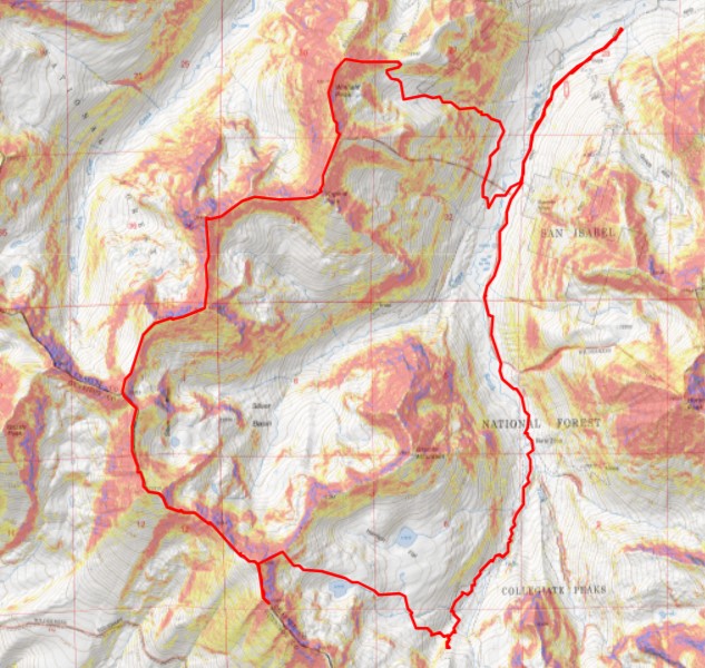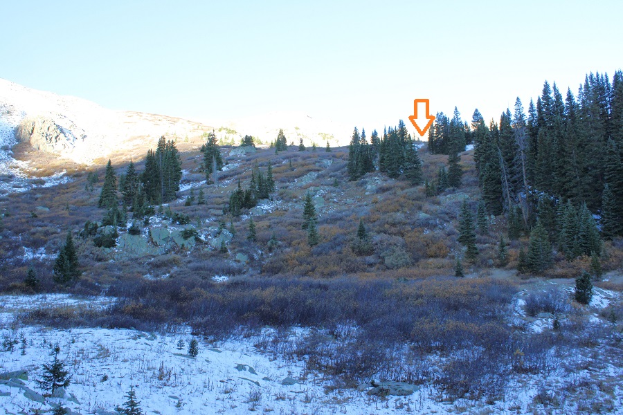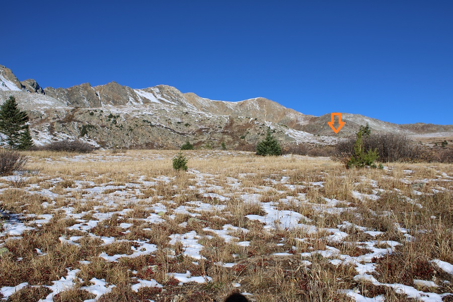 This next part is a little difficult to explain, but at 11600’ I left the trail and headed west, towards Harrison Flat.  Here’s a picture from above at where I crossed