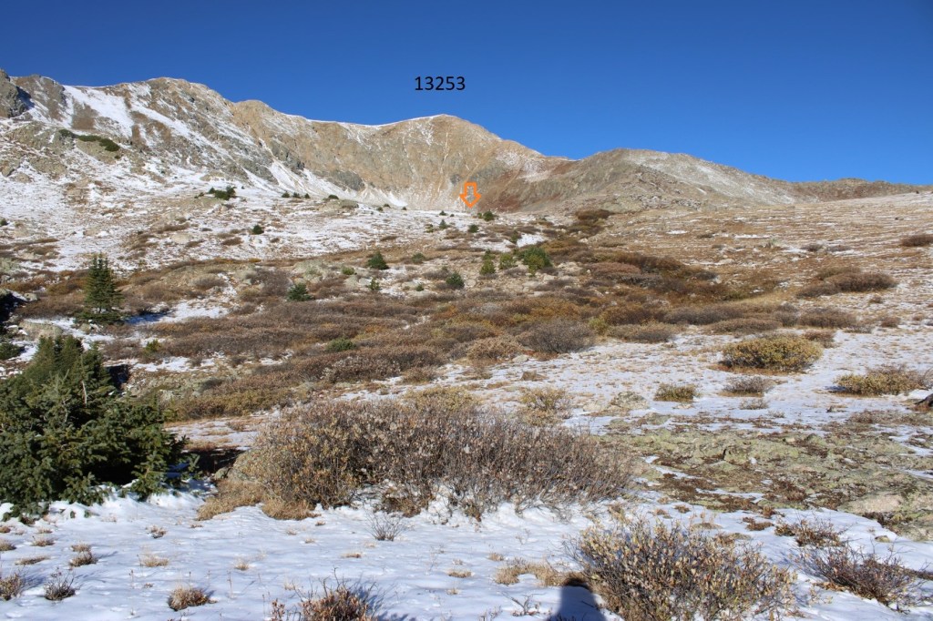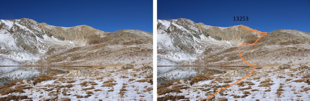 Once at the lake, I skirted it to the right, and headed up the slope.  This is the route I took to the ridge.  This is the overall route I took to the top of 13253.  Note I stayed below the ridge for some time, to avoid the rocky areas.