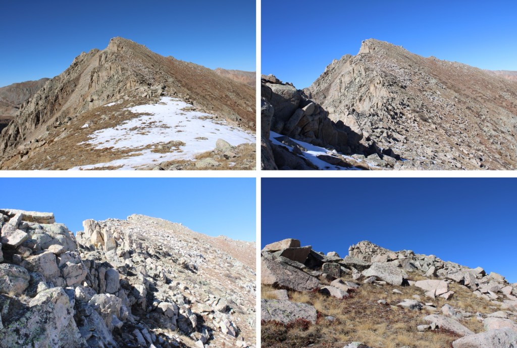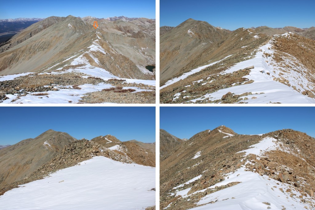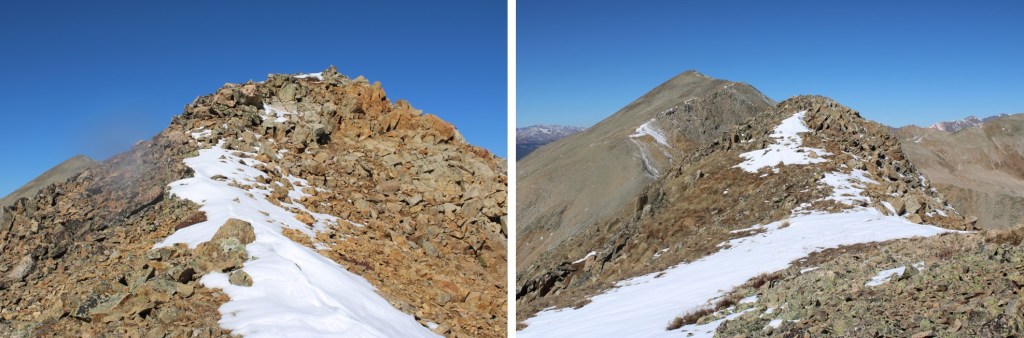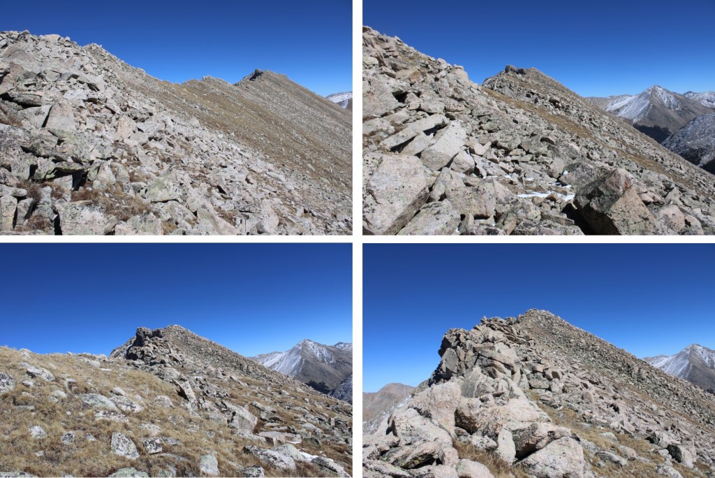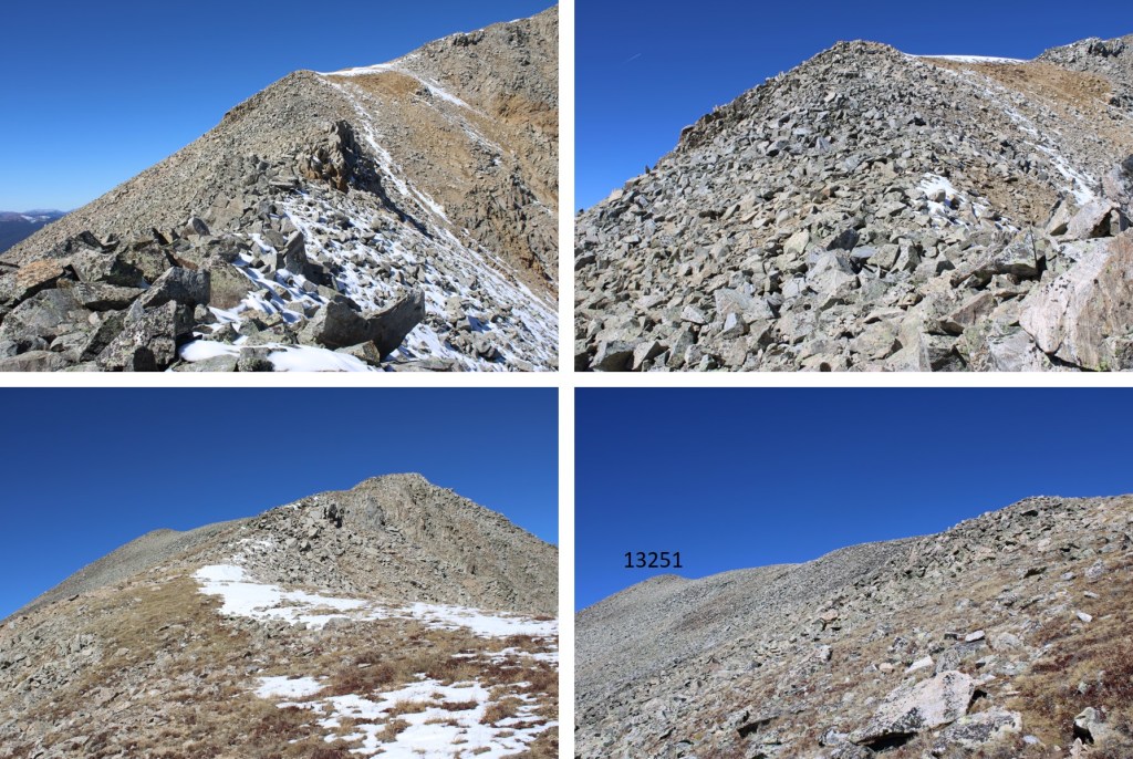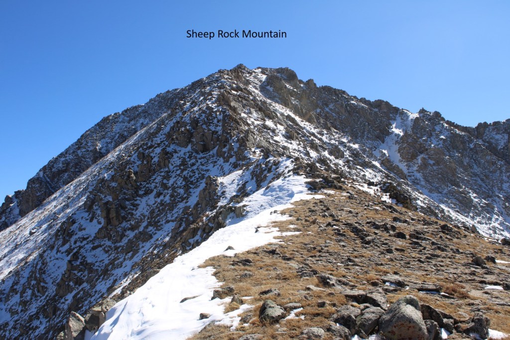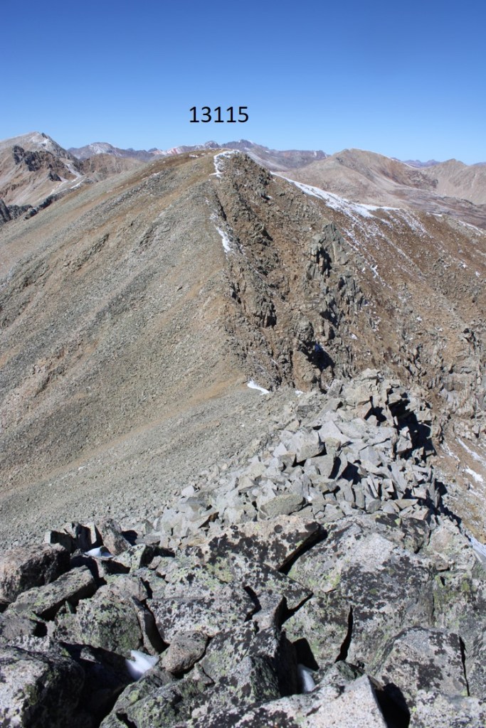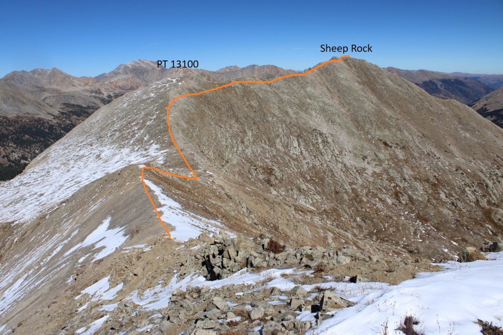 My next goal was Sheep Rock Mountain, which was much further away than it seemed.  First I needed to summit these two points (13115 and 13100, unranked, but they feel like they’re ranked) before following the ridge.  While downclimbing each of these points, there was sugary snow covering the rocks, making the traverse a bit spicey.  Otherwise, it was all class 2.
