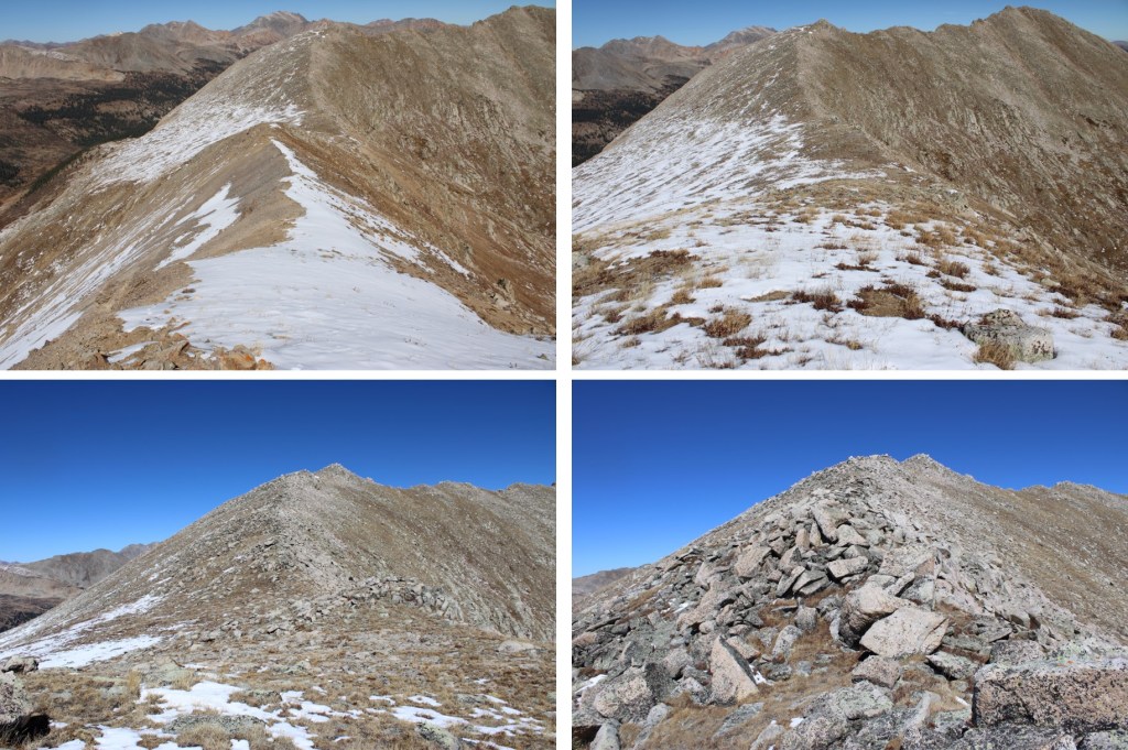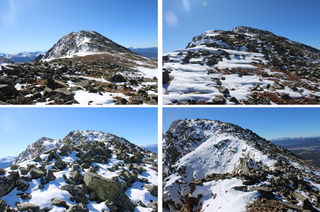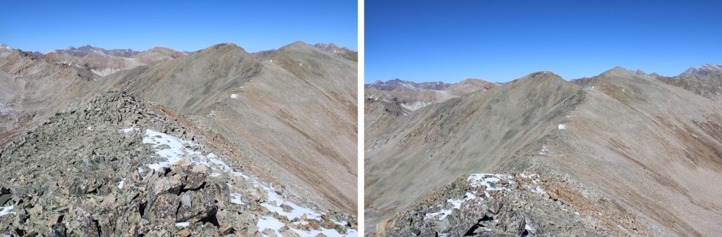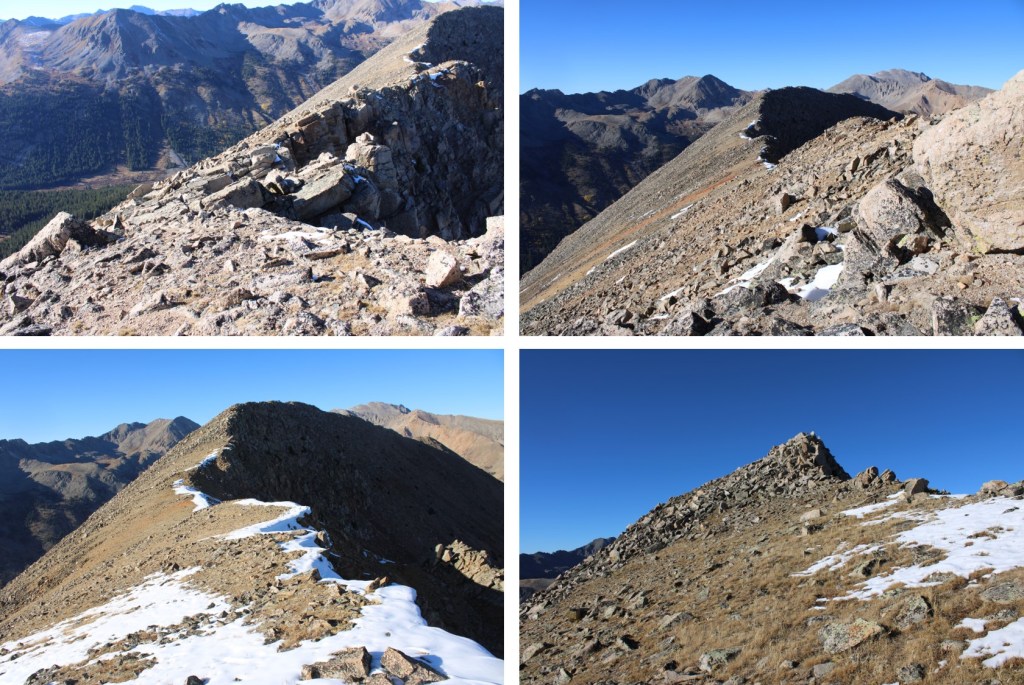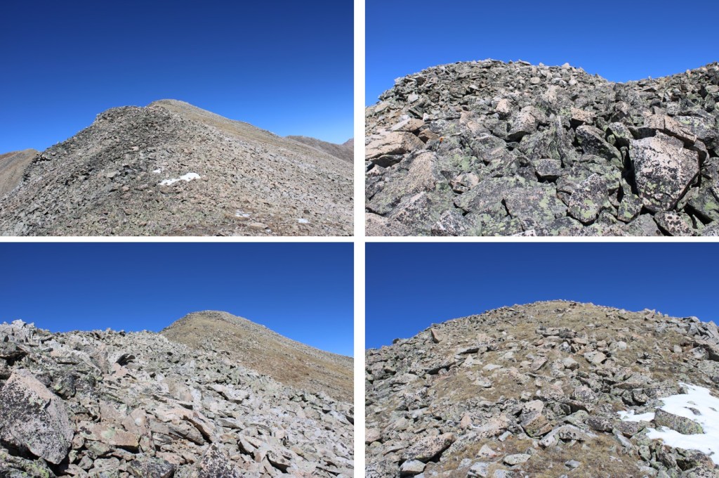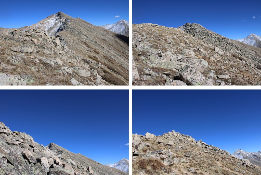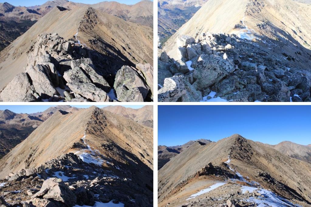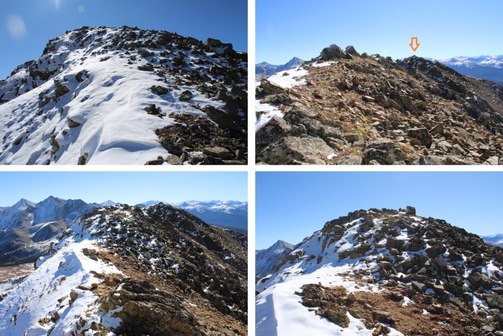 My next goal was Sheep Rock Mountain, which was much further away than it seemed.  First I needed to summit these two points (13115 and 13100, unranked, but they feel like they’re ranked) before following the ridge.  While downclimbing each of these points, there was sugary snow covering the rocks, making the traverse a bit spicey.  Otherwise, it was all class 2.
