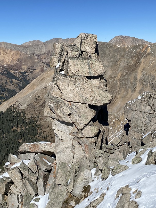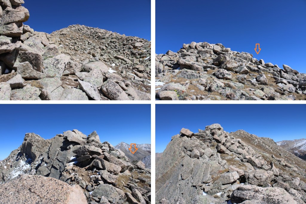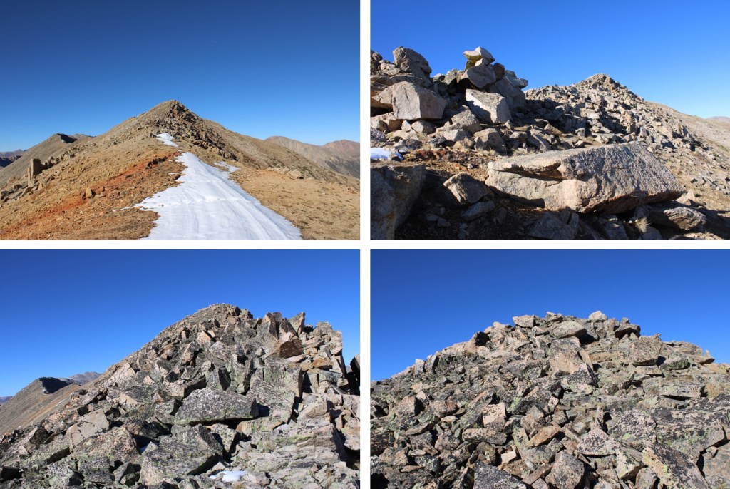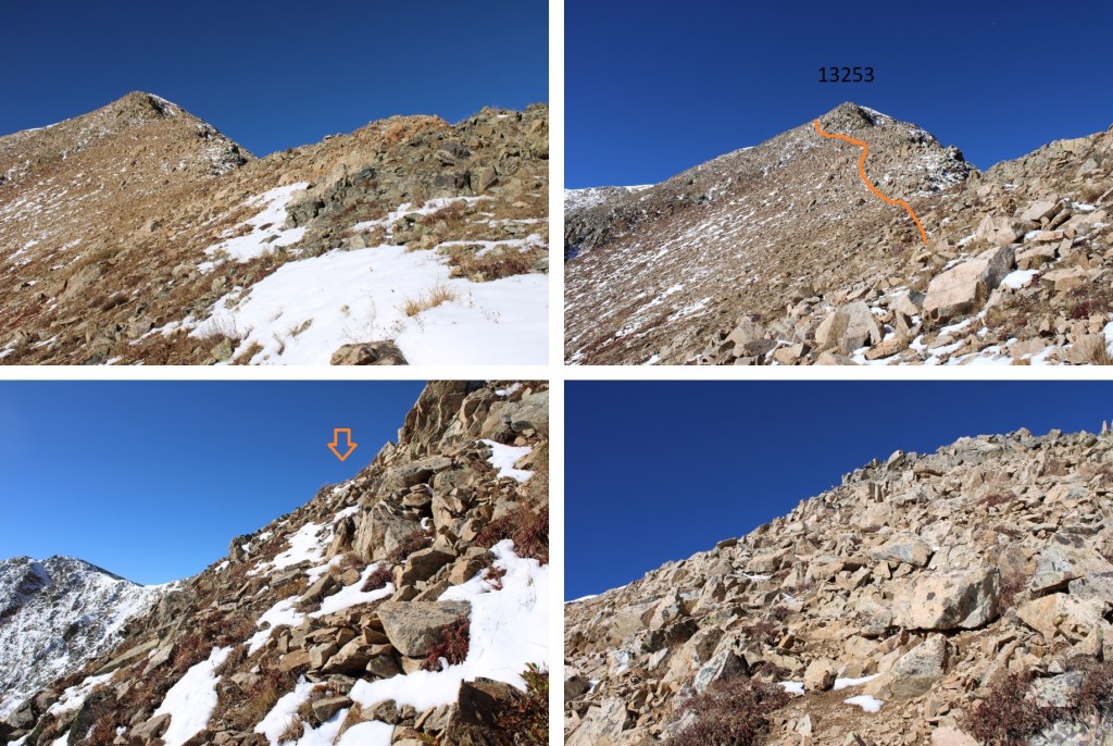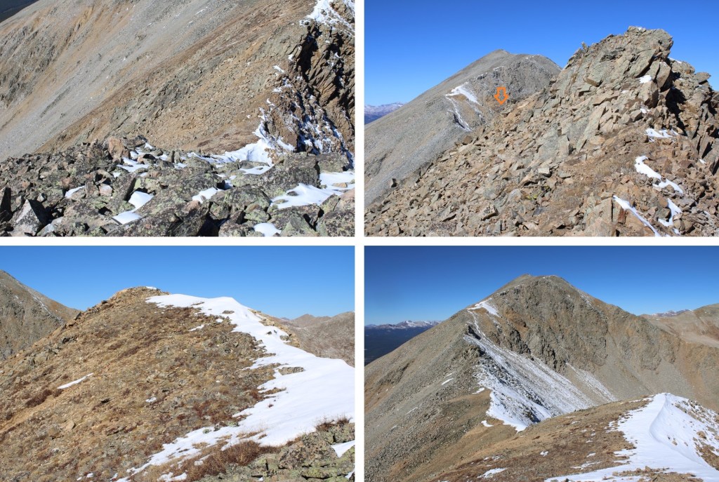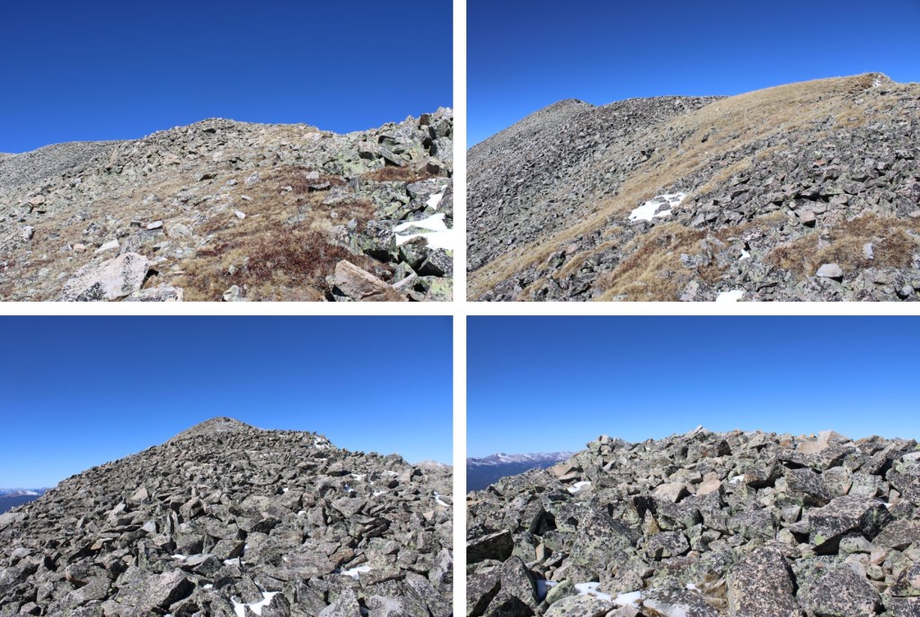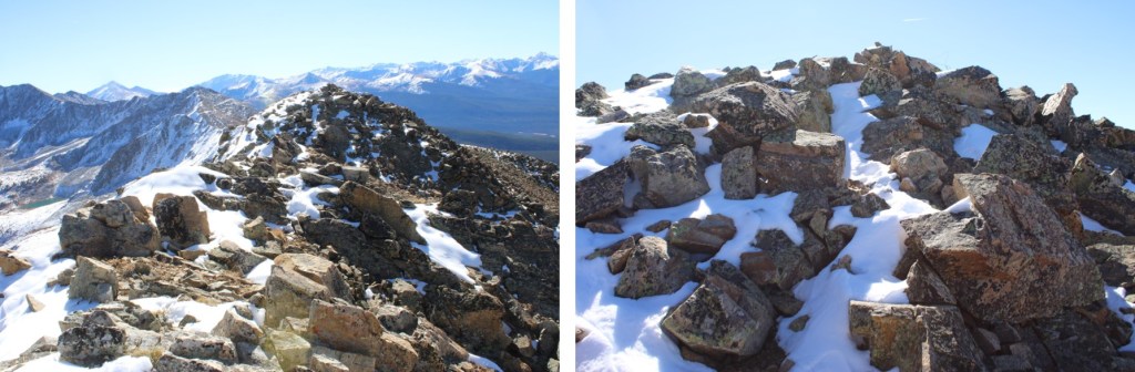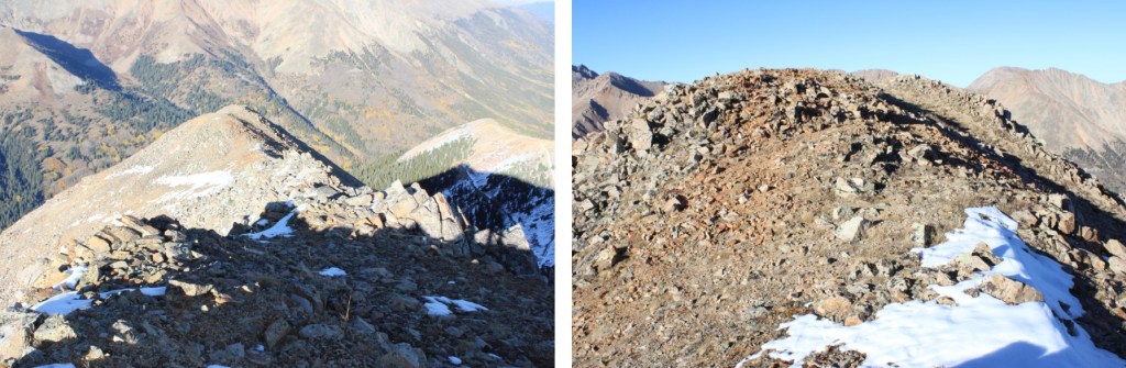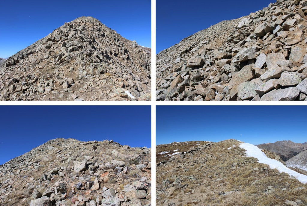My next goal was Sheep Rock Mountain, which was much further away than it seemed.  First I needed to summit these two points (13115 and 13100, unranked, but they feel like they’re ranked) before following the ridge.  While downclimbing each of these points, there was sugary snow covering the rocks, making the traverse a bit spicey.  Otherwise, it was all class 2.