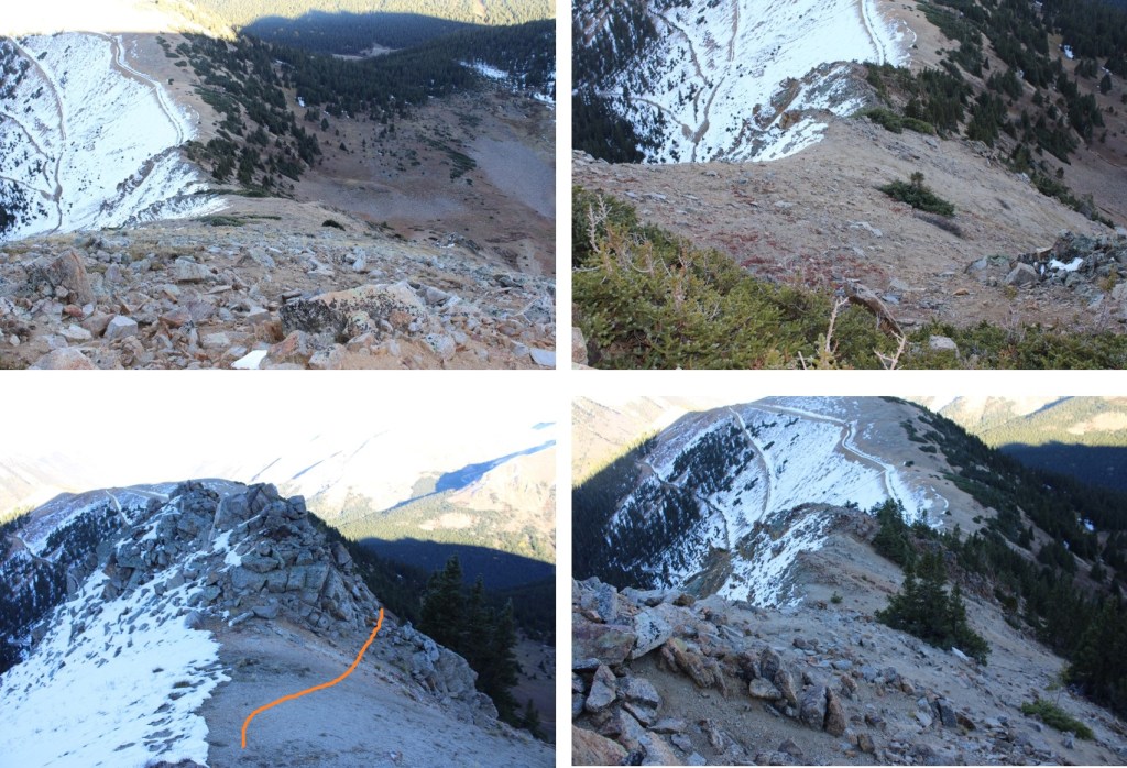 I initially stayed to the left of the rocky ridge to descend towards the saddle, then switched to the right side, and back to the left.  There was snow involved, so I’m not sure what it looks like in dry conditions.  This was all class 2 scrambling.