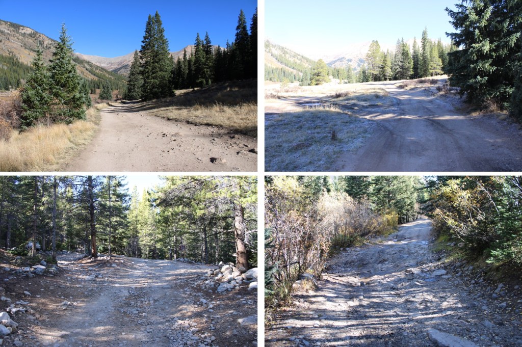 I woke up to a thick layer of frost because it was 27 degrees outside, and was on the trail at 6am.  I followed the 4WD road as it meandered south, past the Lulu Gulch trailhead and numerous dispersed campsites.