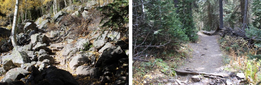 The trail was rocky, and a bit difficult to follow. There was a cairn that was helpful, letting me know when to continue descending