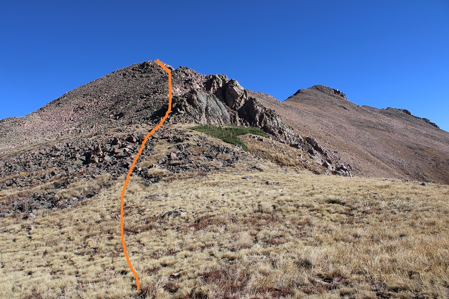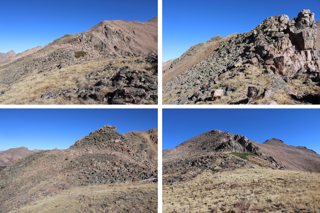 From the pass I turned right, and began heading up the ridge. I was surprised to find a faint trail here. There’s a trail on 95% of this ridge to the summit, although it can be difficult to see at times. This is all class 2, and if you find yourself in class 3 territory you’re off route. Here are some pictures of the ridge.
