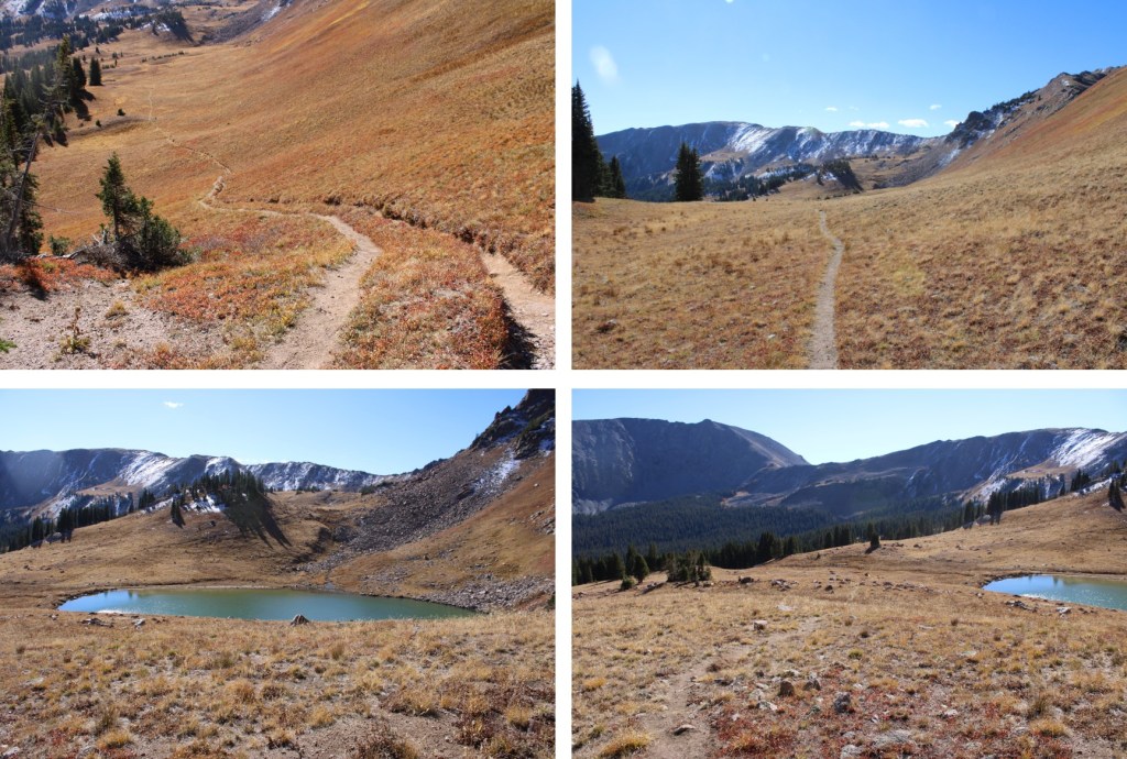 Once at treeline, I came to an unnamed pond. I skirted the pond to the right, on a trail, and followed this trail northwest to Red Buffalo Pass.