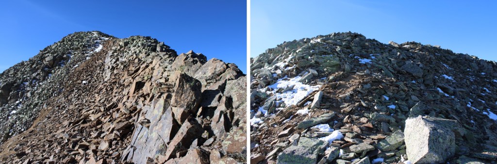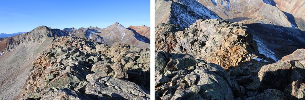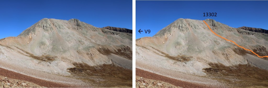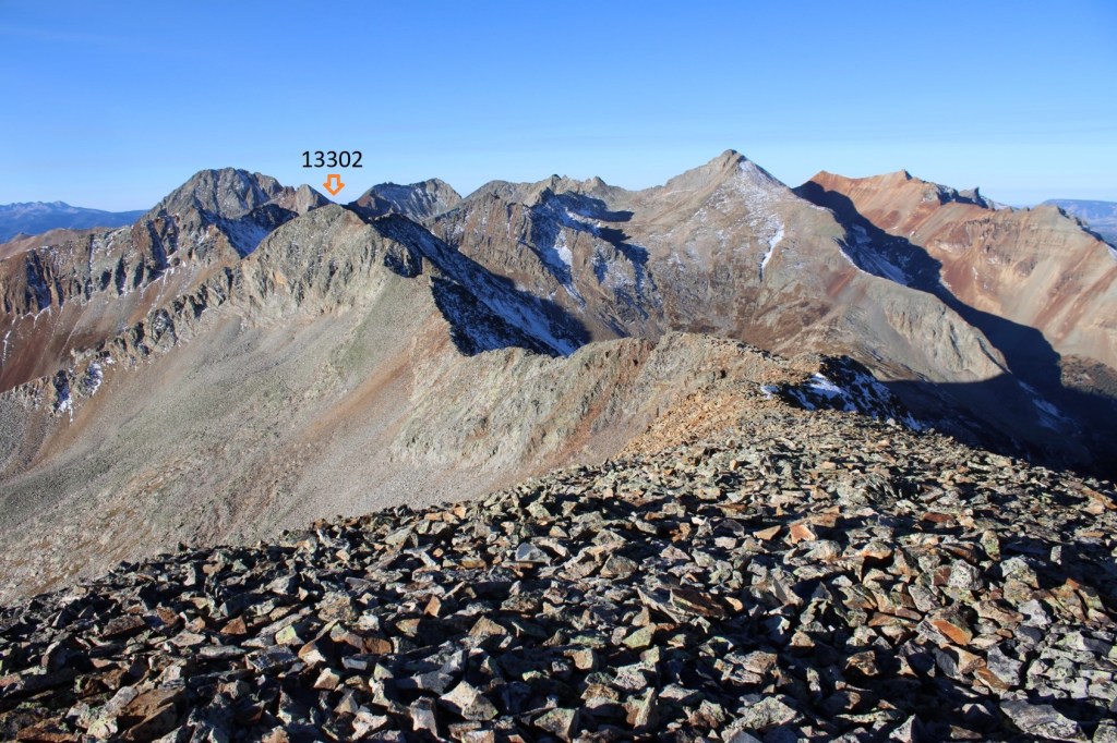 I know the traditional way to descend from PT 13302 is to head southwest and down to the V9/PT 13302 saddle, but I’d been there the day before, and did not want to descend that way.  Instead, I headed southwest towards a small saddle, then turned left and scree-surfed south.