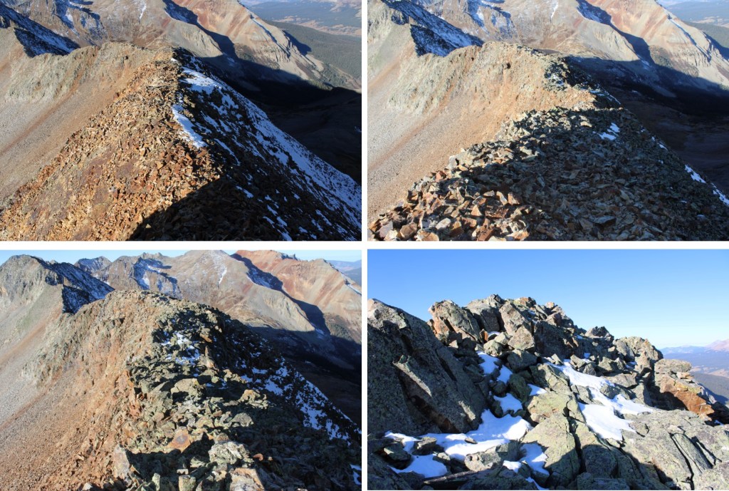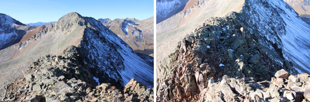 But quickly becomes narrow, sustained class 3 with exposure.  The ridge proper goes at class 3, but twice I dipped down to the left to avoid the exposure involved.  Here are some pictures of the ridge