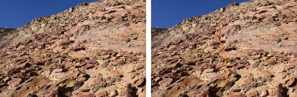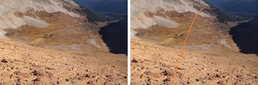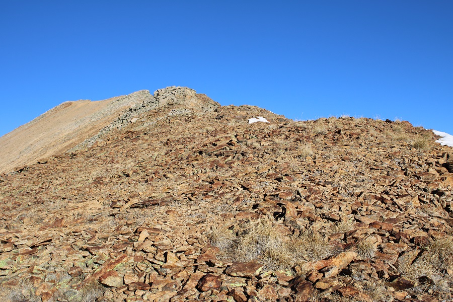 This is where it becomes choose your own adventure. The goal is to gain the ridge.  There’s a lot of class 3 scrambling options to gain the ridge, but I was able to keep it class 2+ by finding lines of scree on the rocks to use.  The scree was mostly sand on top of rocks, but it gave me traction to use and a path to follow. Initially I started going straight up, following the scree