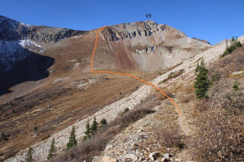 Once on the ridge, I put a small cairn to indicate where I should descend on my way back. I turned right and saw the summit of V9 to the northwest