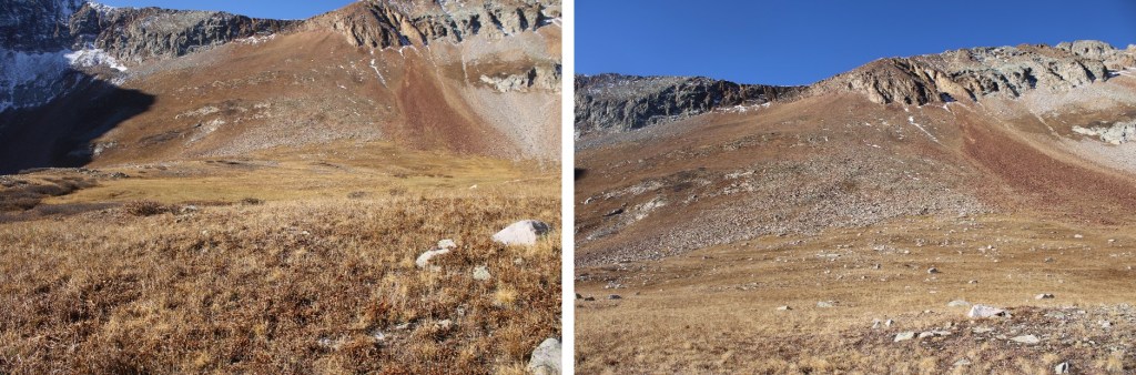 With careful route finding, this can all be kept at class 2+.  First, I headed down the basin to the base of the slope.