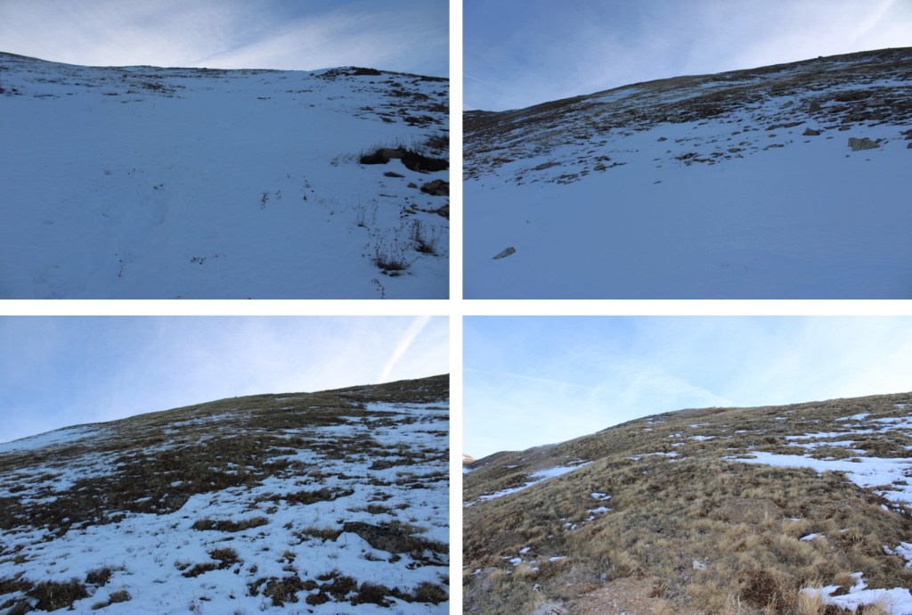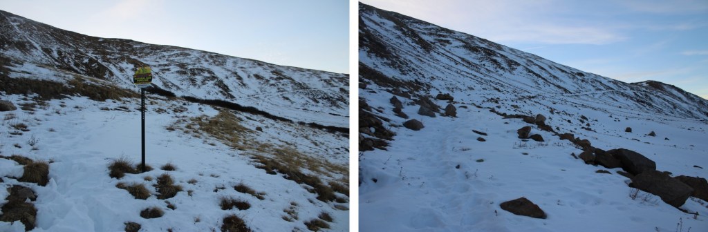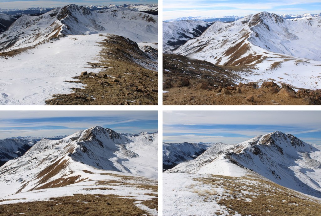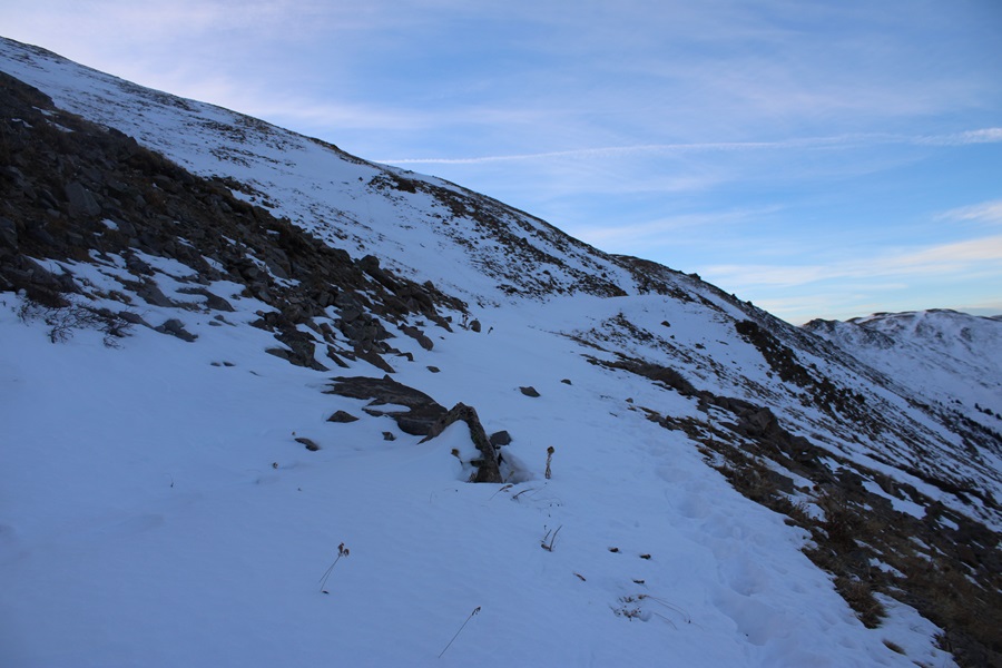 However, I did not take the road to the ridge. The road was full of several feet of snow, but the mountainside only had a few inches of snow, so instead of trenching the route, I headed east towards the ridge. This is the route I took.