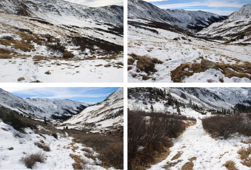 The dirt road quickly becomes a trail, and this morning that trail was filled with a couple of inches of ice. The kind that microspikes slip on. I followed it as it headed northeast into a basin