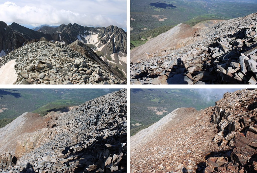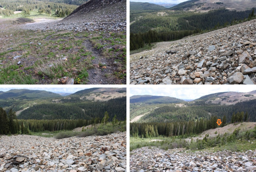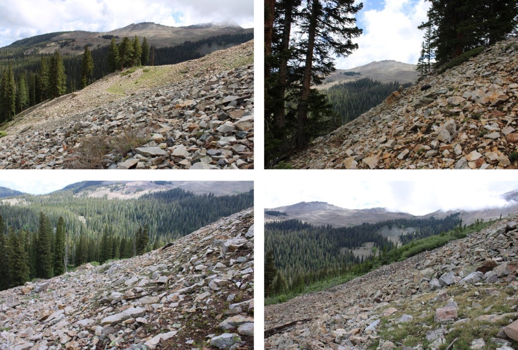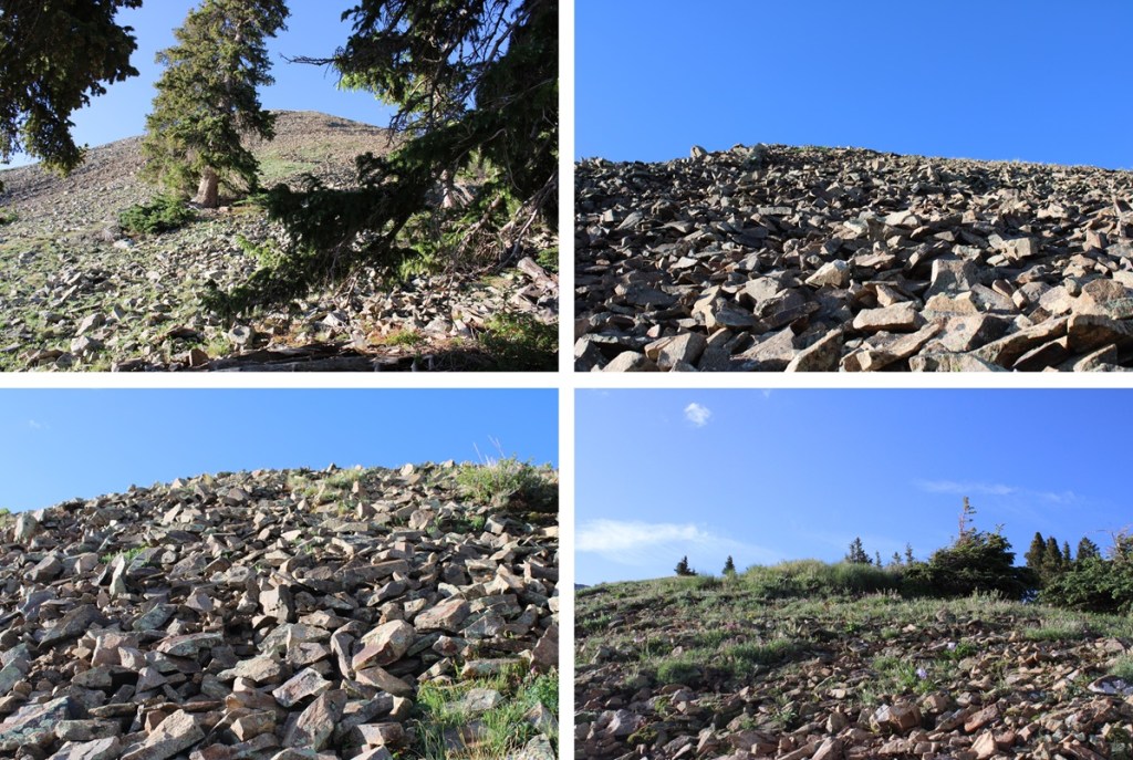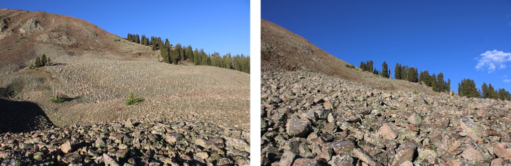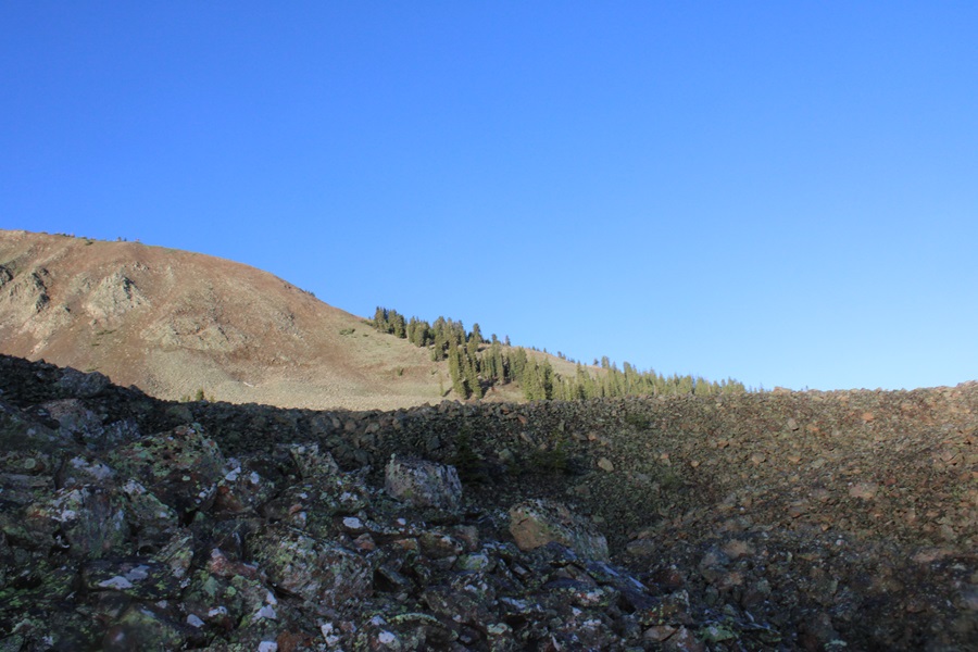 At treeline I came to a huge basin of rocks. To get to the ridge, I was going to have to head southwest, through this basin of loose, unstable rock. I did my best to stay low, and try to skirt the piles of rocks, but eventually I had to go up and over.
