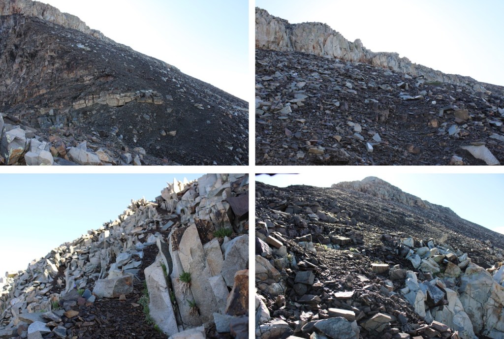 Once on the ridge, I turned left, and encountered the most difficult part of my day: Tons of mosquitoes and 350’ of elevation gain in 1/10th of a mile on dinner plate sized, extremely loose talus. There was no clear path or game trails, I just kept heading up. It was so miserable, I decided then and there I was not going to go back down this way if I could help it.