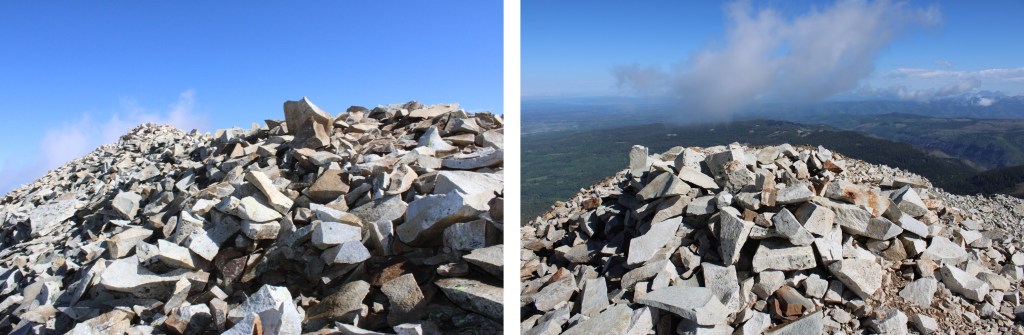 The summit was to the left of the trail, filled with large, loose boulders, and a wind shelter.