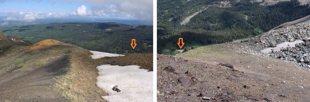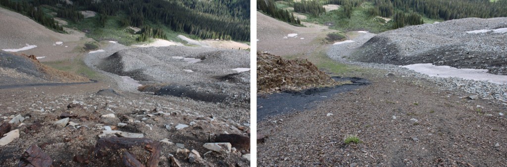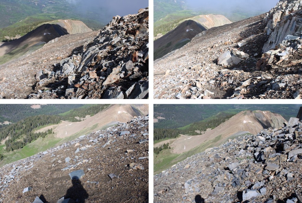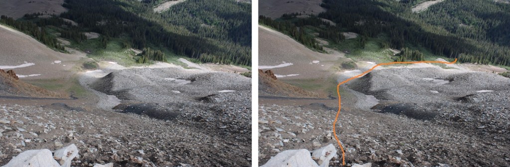 Here’s the route I took down the gully. Since it had rained the night before, the scree was a bit muddy, and easy to grip.