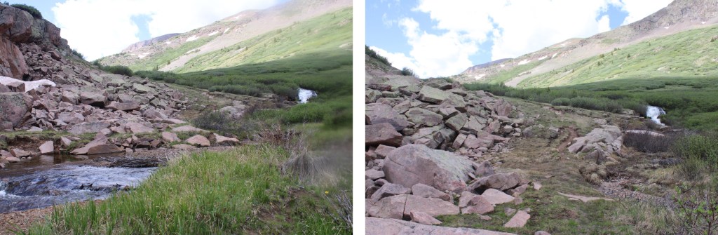 I was now headed south towards Cataract Lake.  There’s a pretty good trail here, but every once in a while it gets overgrown.  The trail slopes slightly downward as it goes across the tundra and through the willows. There are posts to help guide you if you lose the trail. I was headed here: