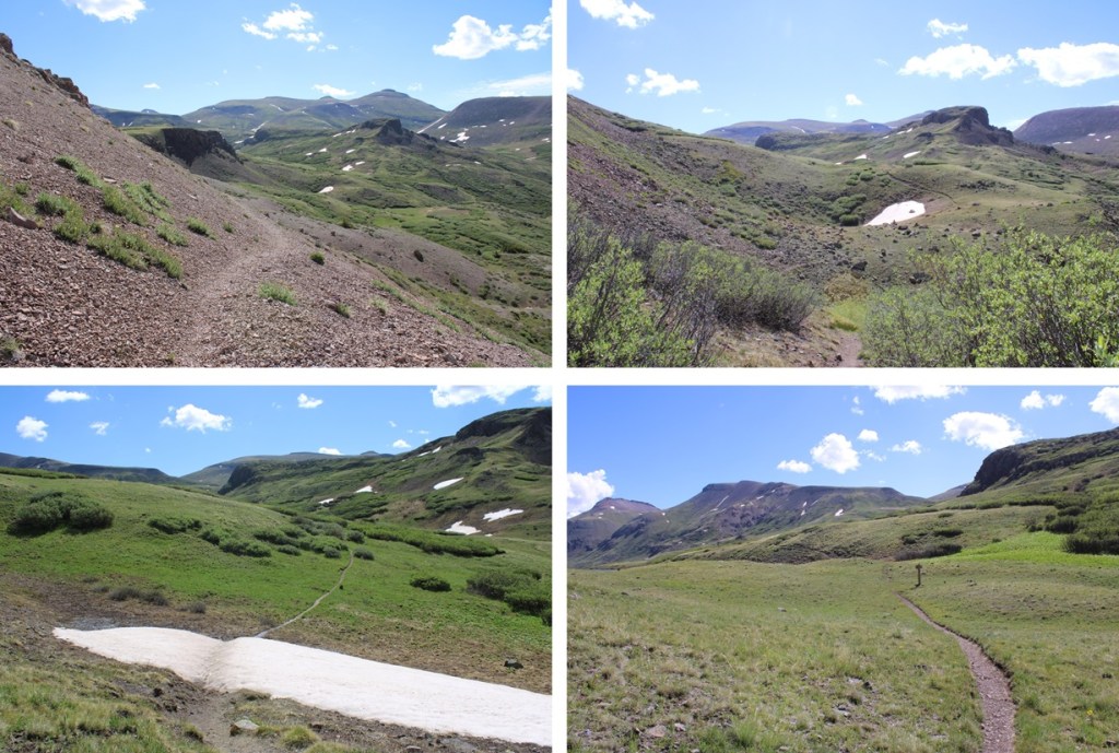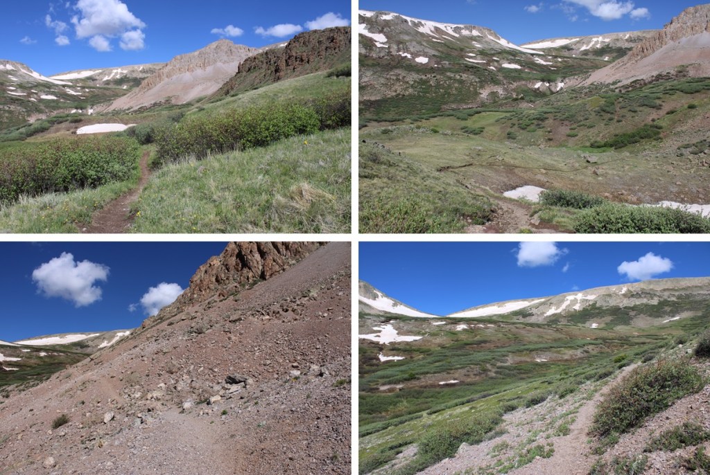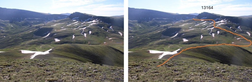 This was an out and back hike for me, so I turned around and retraced my steps.  Here’s my route back down the saddle, skirting around the left side of PT 13164, following the Colorado Trail.
