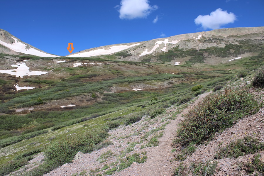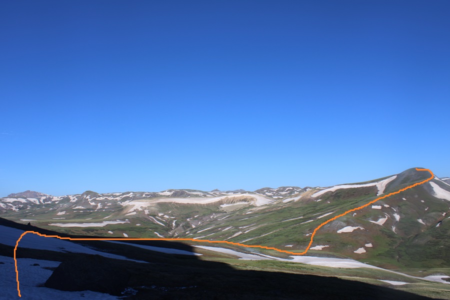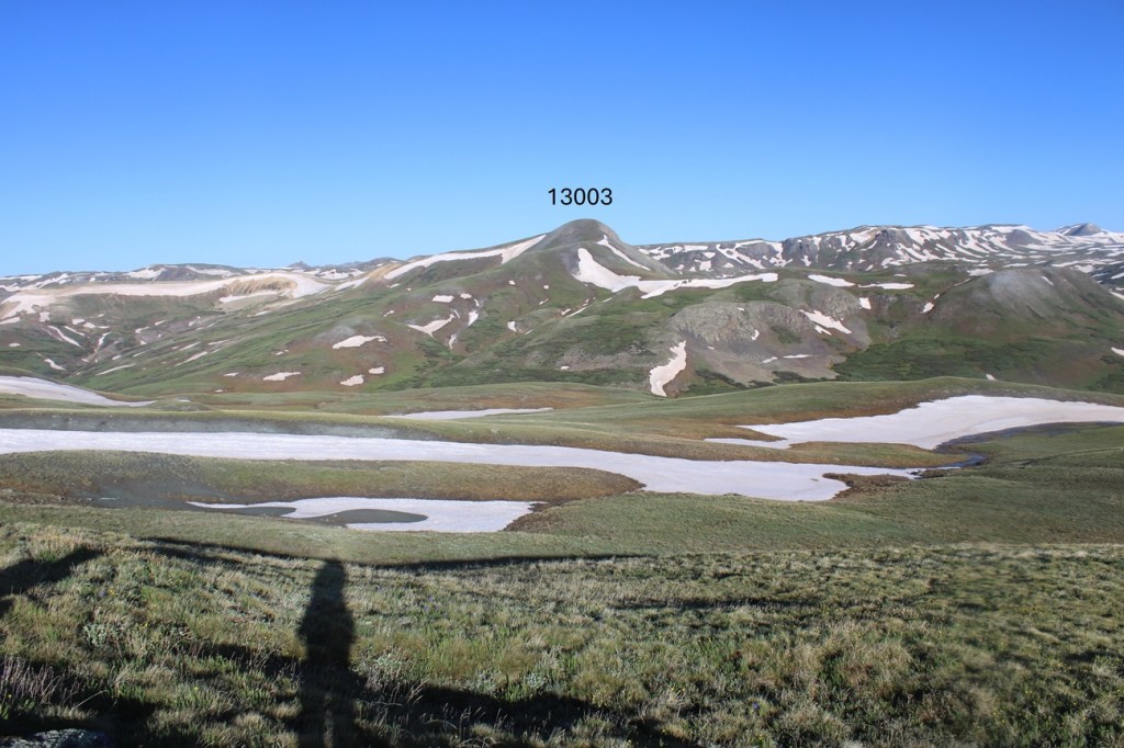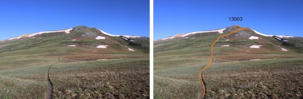 I stayed on the Colorado Trail until I hit the saddle of 13164 and 13003, losing about 500’ of elevation, then left the trail and took the tundra covered ridge to the summit.  This is the route I took.