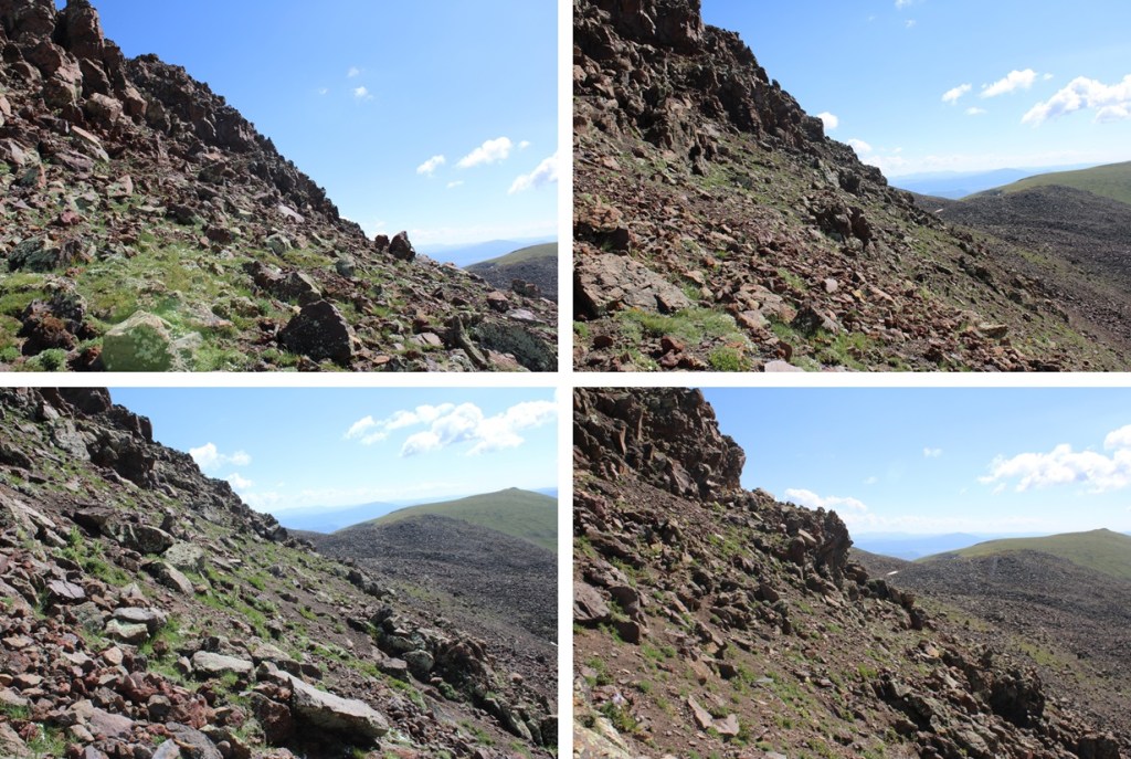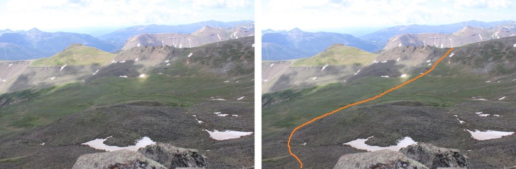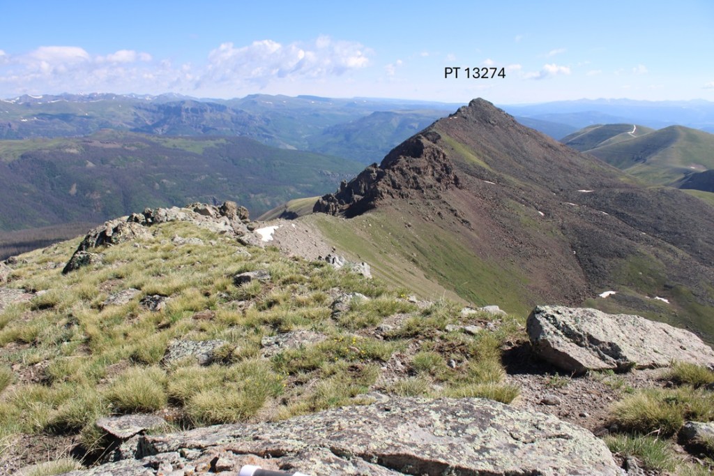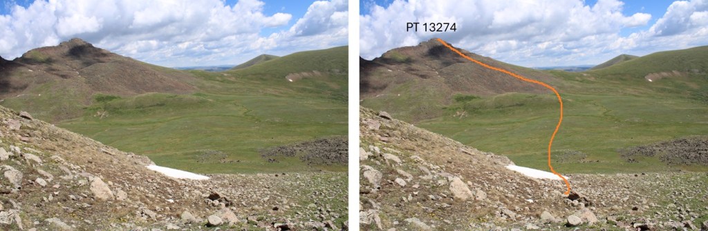 I was making this a bit of a loop. From the summit of 13274, this was my overall route to the saddle to the south. This was choose your own adventure, but the route was obvious.