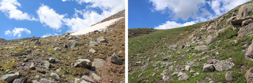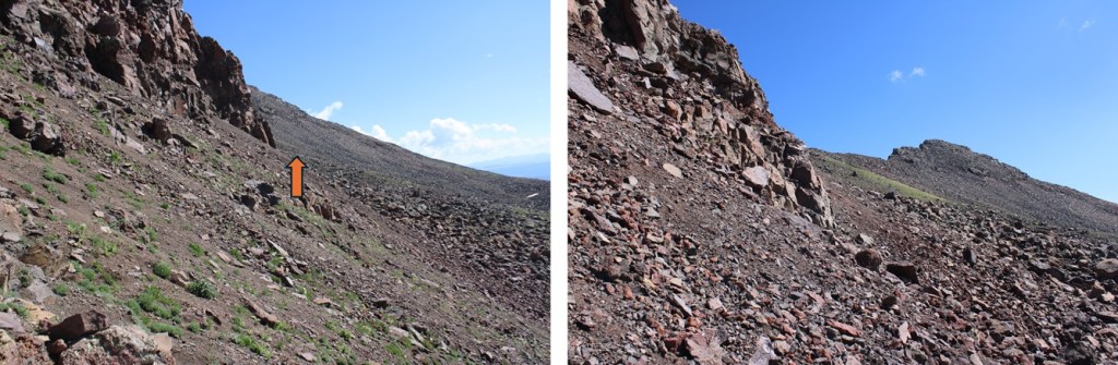 At the saddle I skirted the crumbly rock formations to the right, dropping down to about 12990’