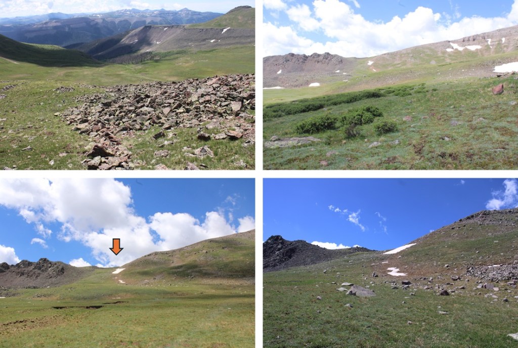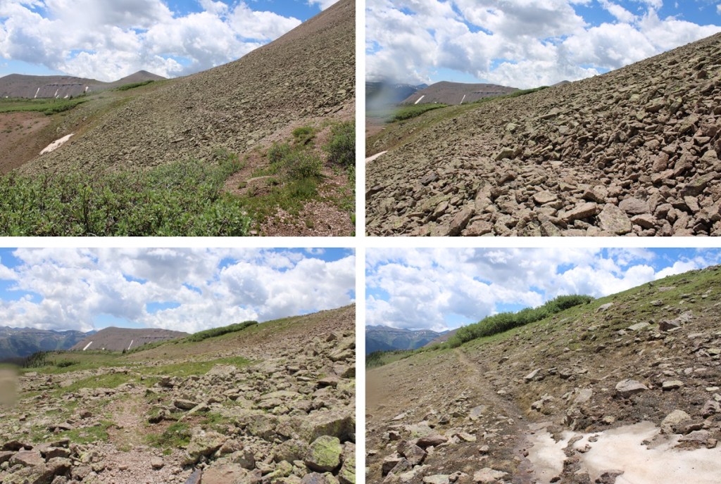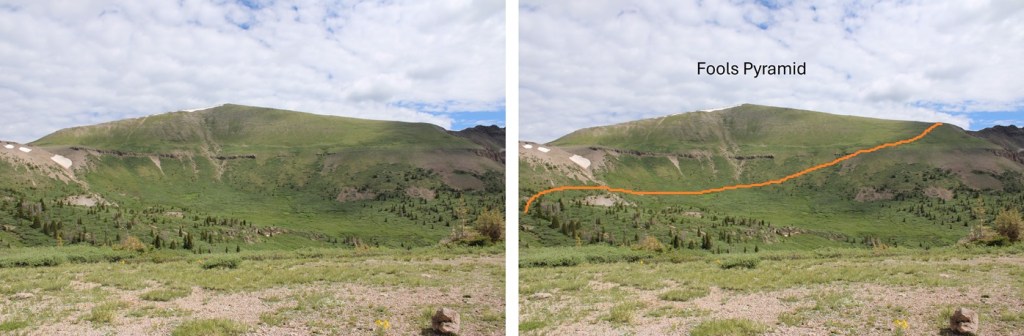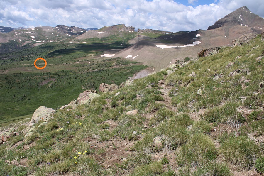 There are several ways to make it back down into the basin. I considered just staying parallel with the ridge at about 12600’ and picking back up the trail I came in on at the saddle of Rio Grande Pyramid and Fools Pyramid. There are no established trails here, but I knew the Skyline Opal Lake Trail was directly below me, so I decided to do my best to make it back down to the trail. If you look closely, you’ll see the trail below you.