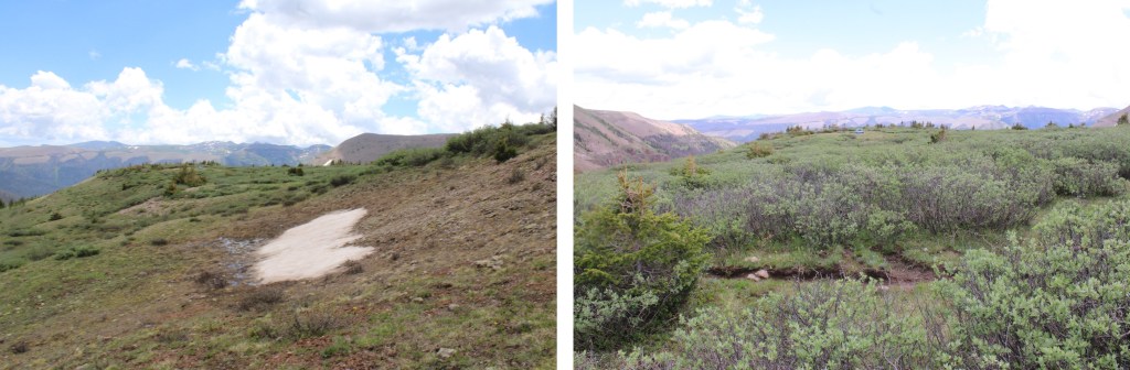 I took some time to set up my campsite, and was on the trail again at 8:30am. From my campsite near the Continental Divide Trail I headed northwest. Maps show a trail here (Skyline Opal Lake Trail), but it was difficult to find. Much of the trail was overgrown with willows and grass, so when I couldn’t find a trail, I kept heading northwest, and eventually found it again.