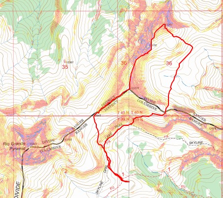 This is the overall route I took to gain the saddle between Rio Grande Pyramid and Fools Pyramid: