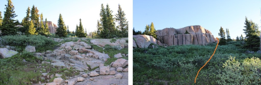 At the first rock outcropping, head for the tree that’s cut in half at the top of the rocks