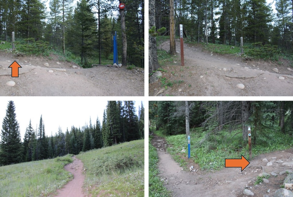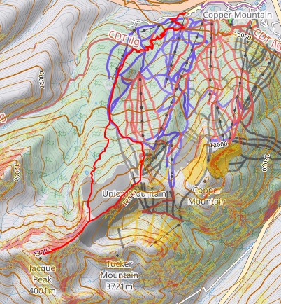 But I didn’t descend entirely the same way I ascended.  Instead, about halfway along the ridge between Jacque and Union, I turned left and headed north down the West Ridge Traverse Route.  I took West Ridge Traverse to Soliloquy to Roundabout, then Fairway to The Colorado Trail.  It sounds daunting, and at times the runs get narrow, but I just followed the wooden posts initially, then the Ski Area Boundary signs and little pieces of pink surveyor’s tape heading down and south (there are signs every 30 feet or so), staying on game trails to the right of the runs.  And you don’t need to take the same route I did.  As long as you’re headed down on a ski run, it’ll take you back to the lifts.