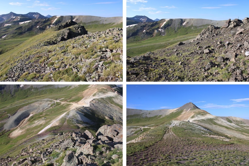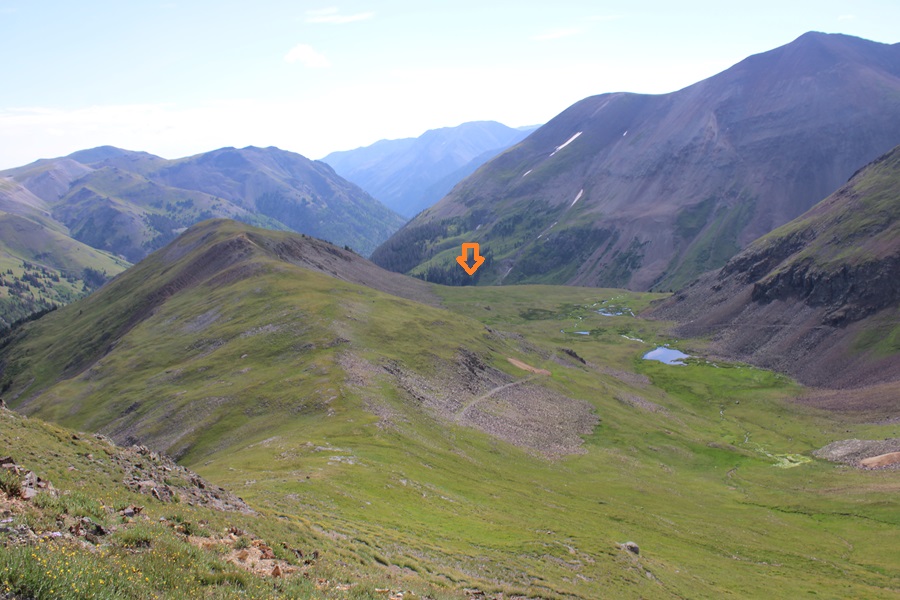 I followed this road, and yes, it led me in the correct direction, but what maps couldn’t tell me was this was an old mining road that hadn’t been used in years.  So many years much of the road was destroyed due to avalanches or rockslides and due to the road being “closed” to vehicles, much of the road is now grass and flowers.  However, enough of the road was intact for me to figure my way down.  I headed east, following the road when I could, heading towards the obvious 4WD road in the distance paralleling Schafer Gulch when I couldn’t.
