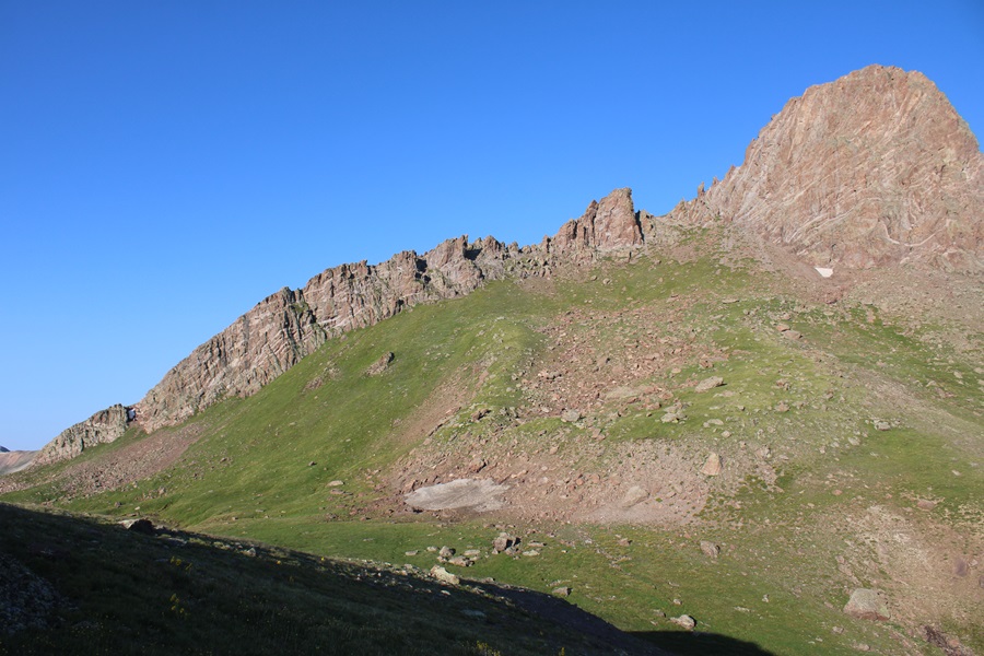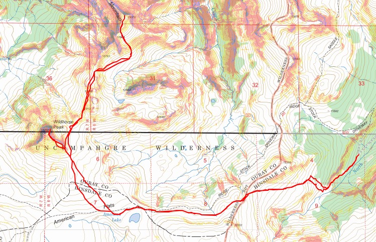 Here the trail got ‘iffy’, as it turned into a kind of mining road that hasn’t been used in several decades. I followed it as I passed American Lake to my left. After hiking for a total of just over 3 miles, and at around 12290’ of elevation, I left the trail to head northwest towards the saddle of Wildhorse Peak.