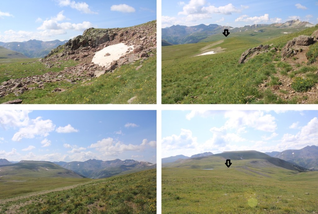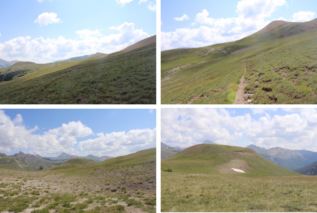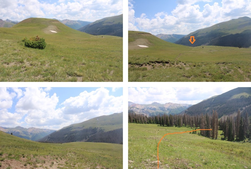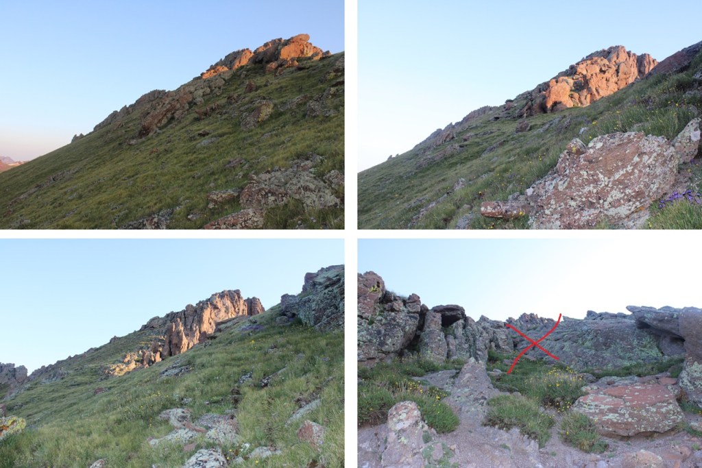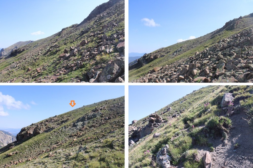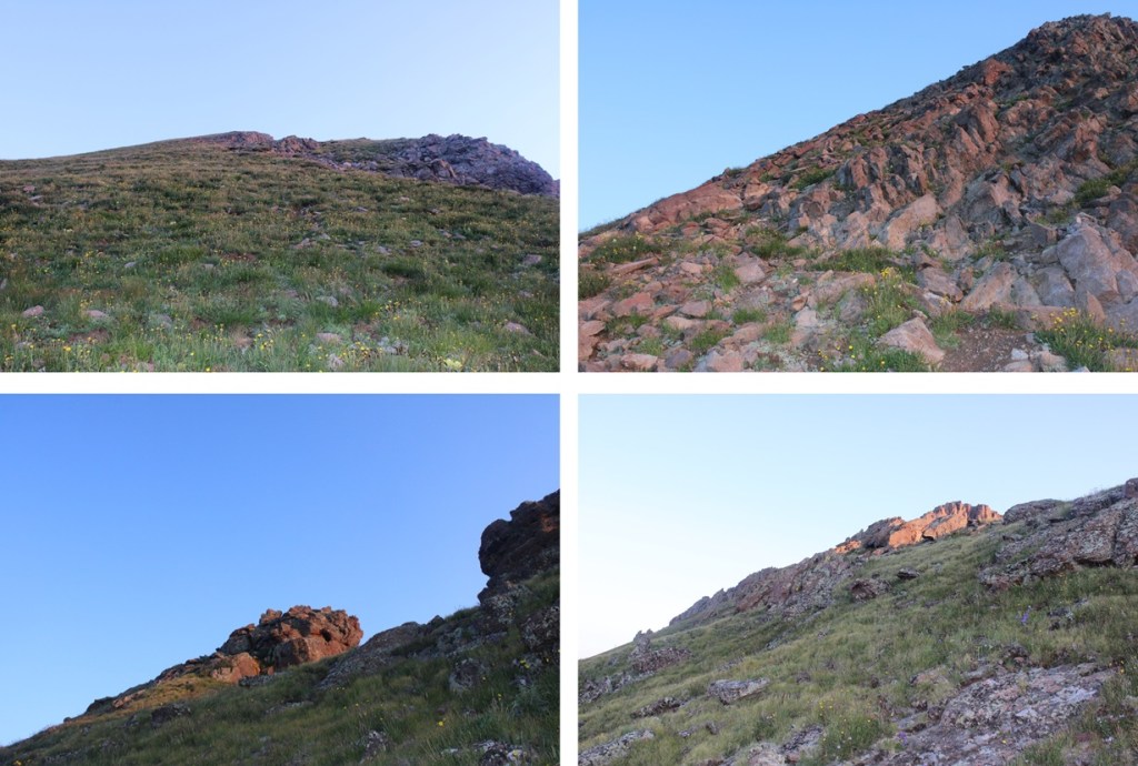 The true summit isn’t the large rock formations you’re seeing to your left, but rather just northeast of the grassy gully. I ascended out of the gully to the right, and saw where I’m sure that bear had been sleeping overnight. No scat or footprints in the area, but fur on the rocks.