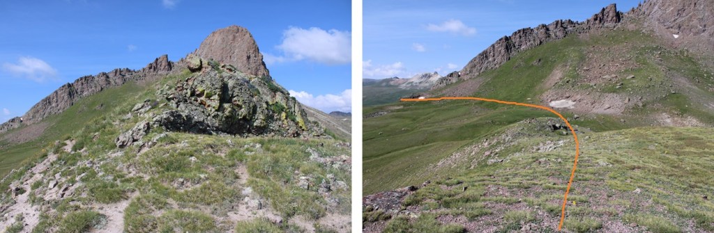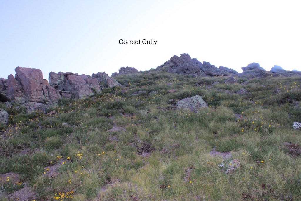 Looking back, you can see the gully I downclimbed. There is an upper one you can downclimb as well, but when I looked down it, it looked like slick rocks covered in kitty litter, and I didn’t think it was worth the effort.